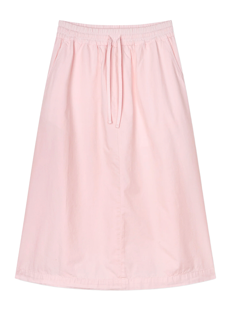 Een A-lijn midi-rok van katoen met een verstelbare elastische tailleband, trekkoord en zijzakken.