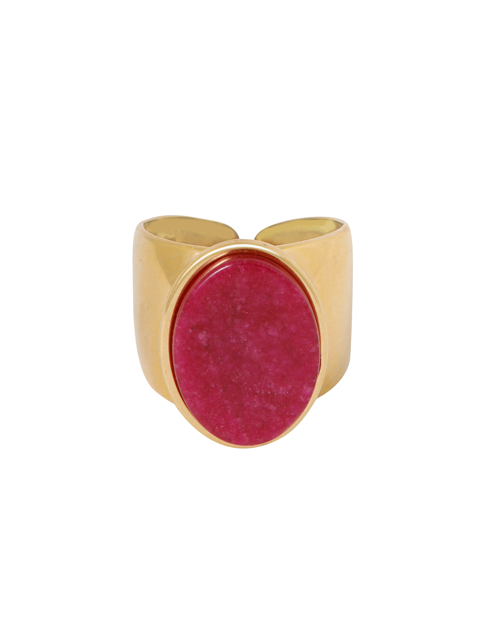 Een elegante vergulde ring met een opvallende ovale steen in een stralende cyclaamkleur. De afmeting van de steen is 1.8 x 1.4cm. Verguld op longlasting stainless steel.