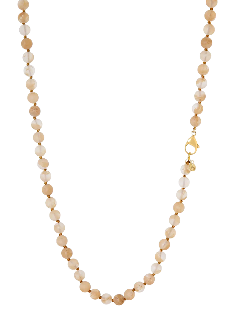 Lange gemstone ketting met warm gele tint. De ketting heeft een lengte van 36 inch (90 cm) en is afgewerkt met een slot en een klein logo tag. De ronde gemstones hebben een diameter van 8 mm. Perfect om los te dragen of te layeren.