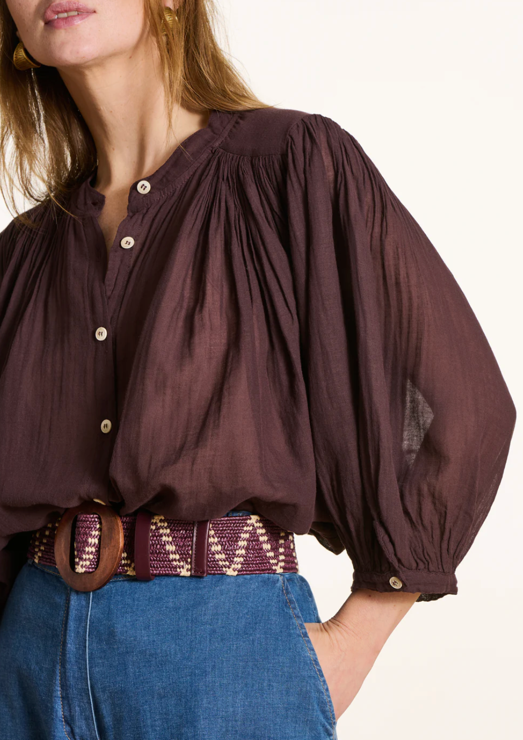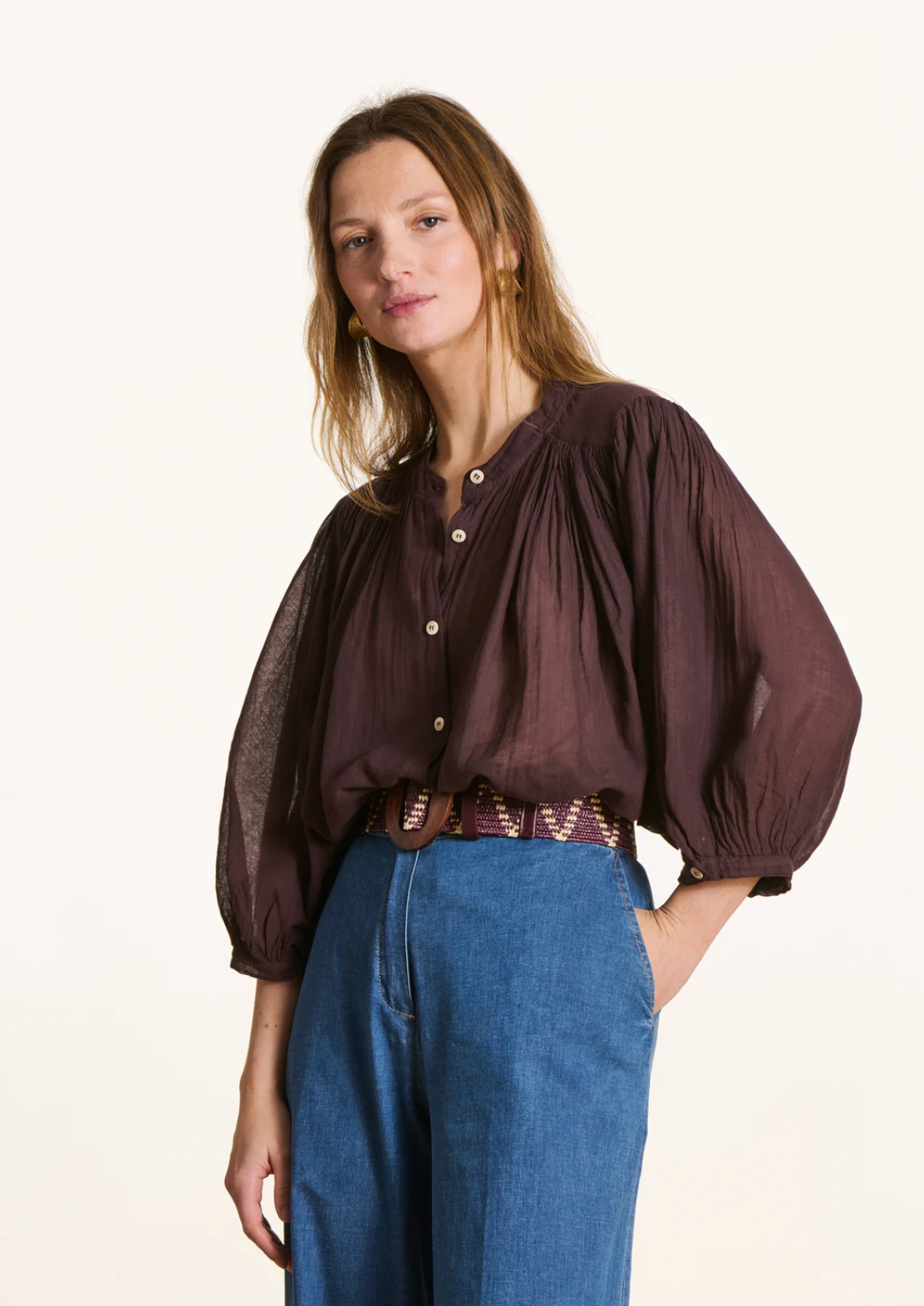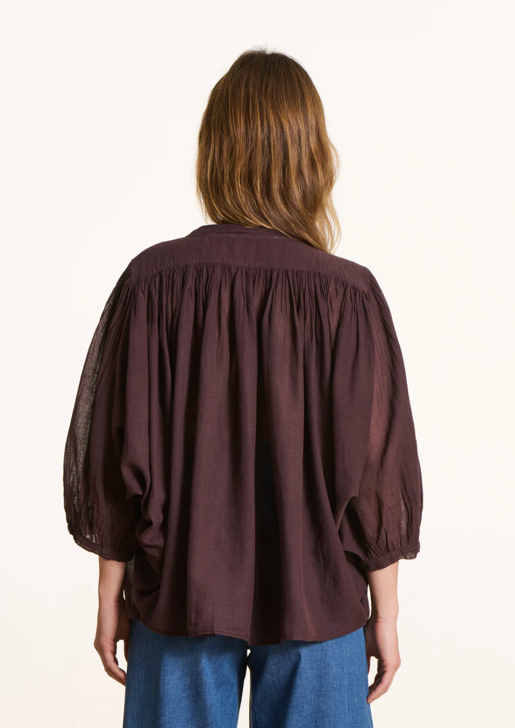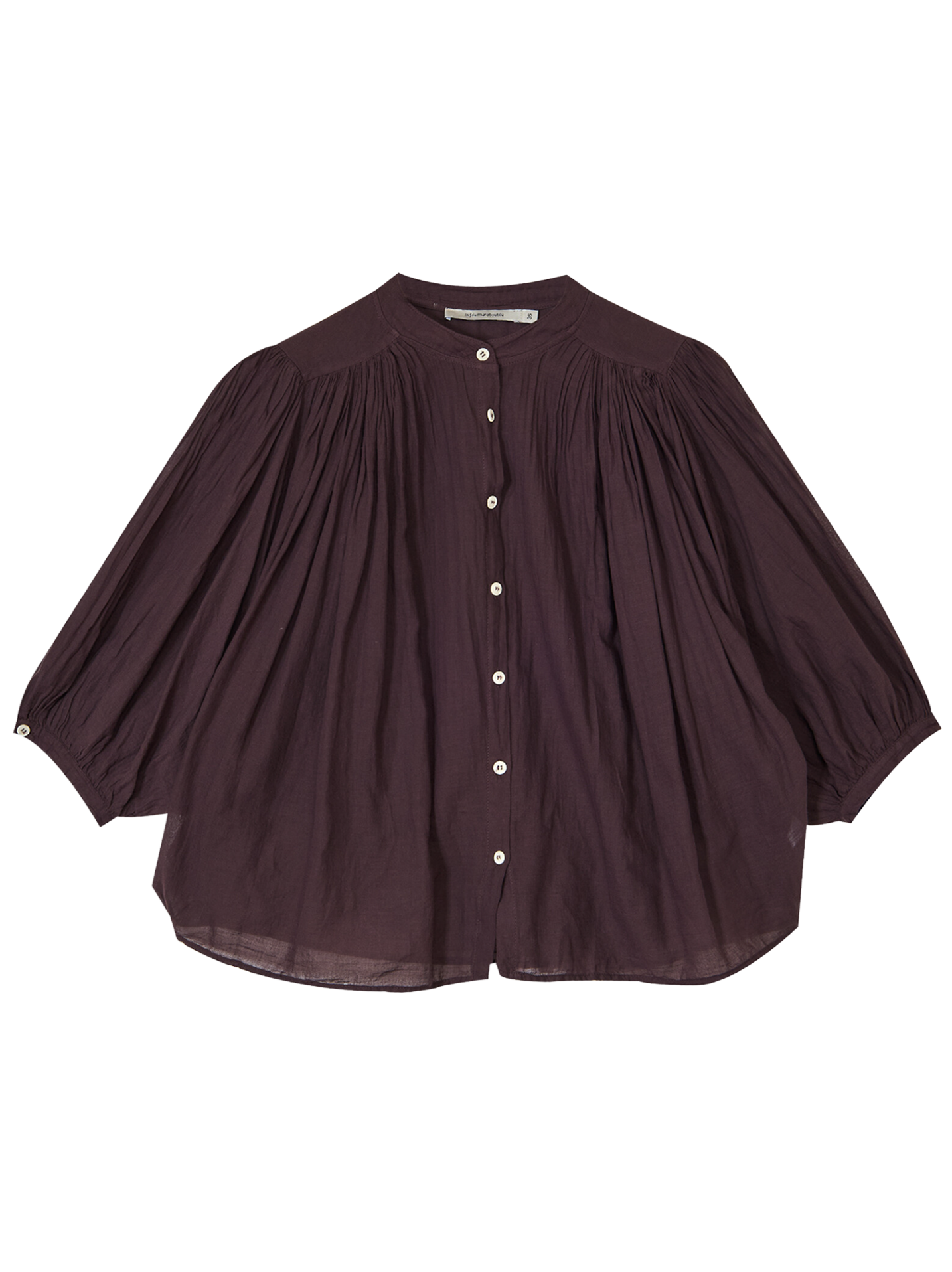 Losvallende blouse van effen katoenen voile. De blouse heeft een Mao kraag en 3/4 vleermuismouwen met knoopmanchetten.