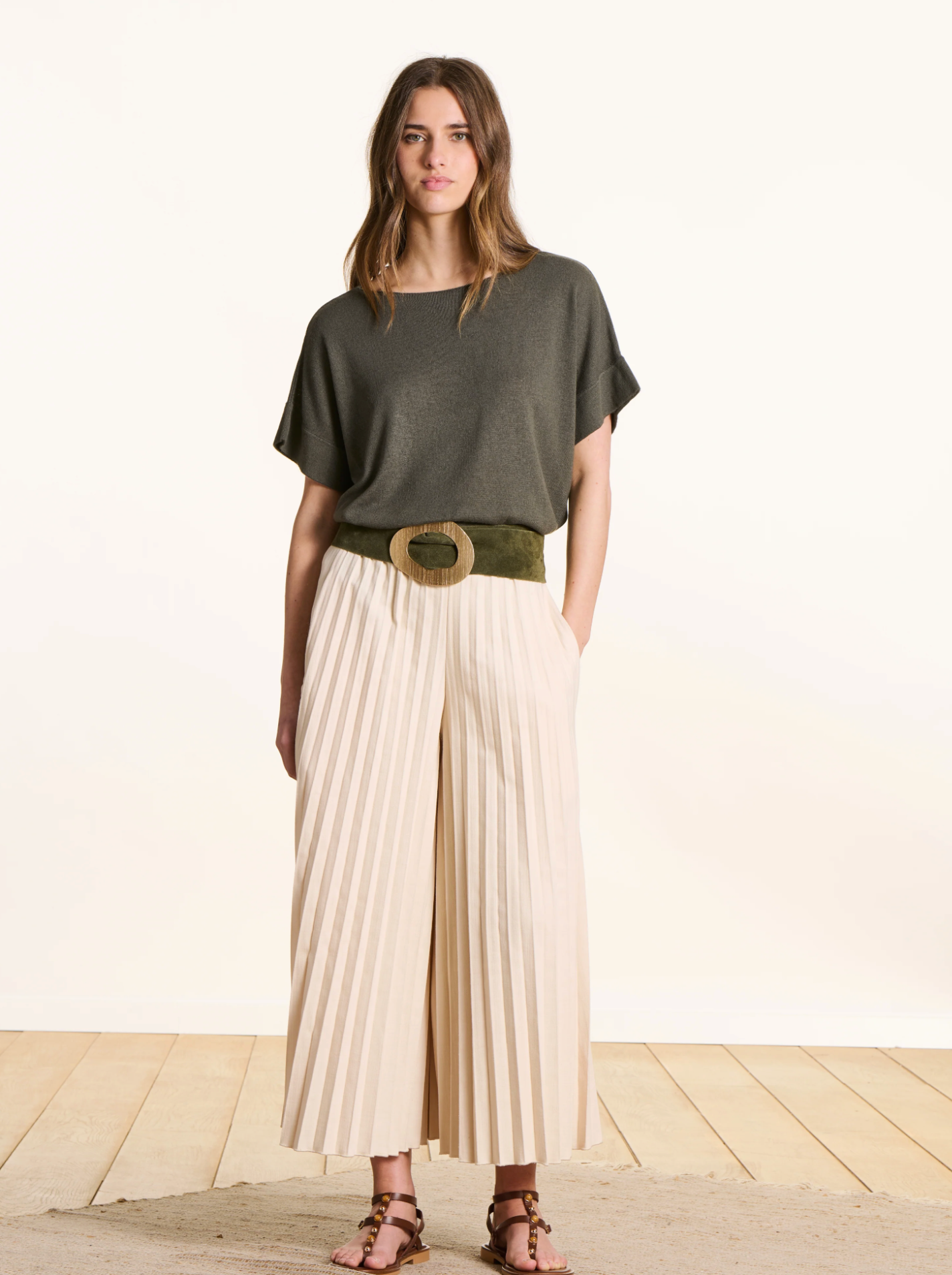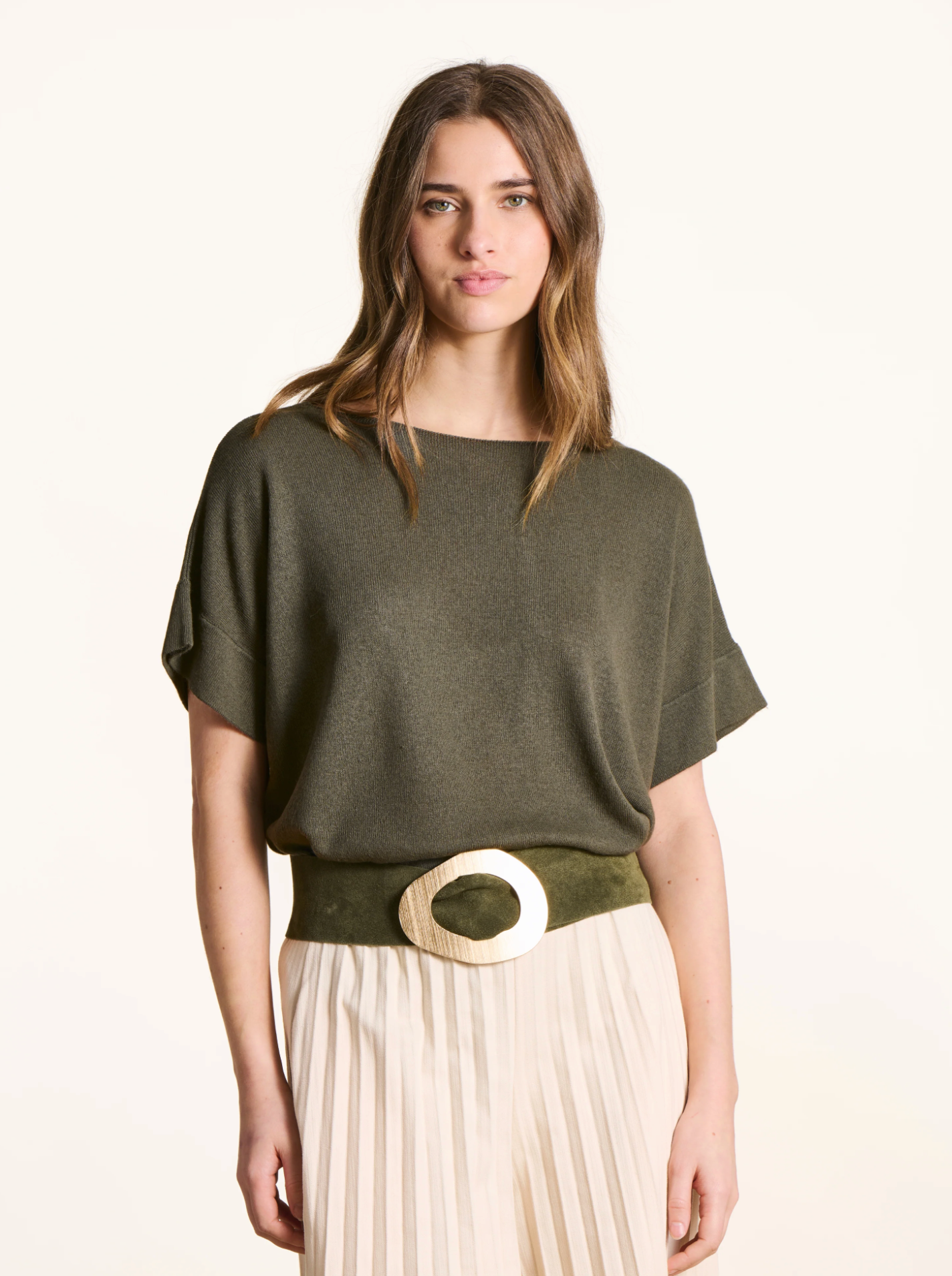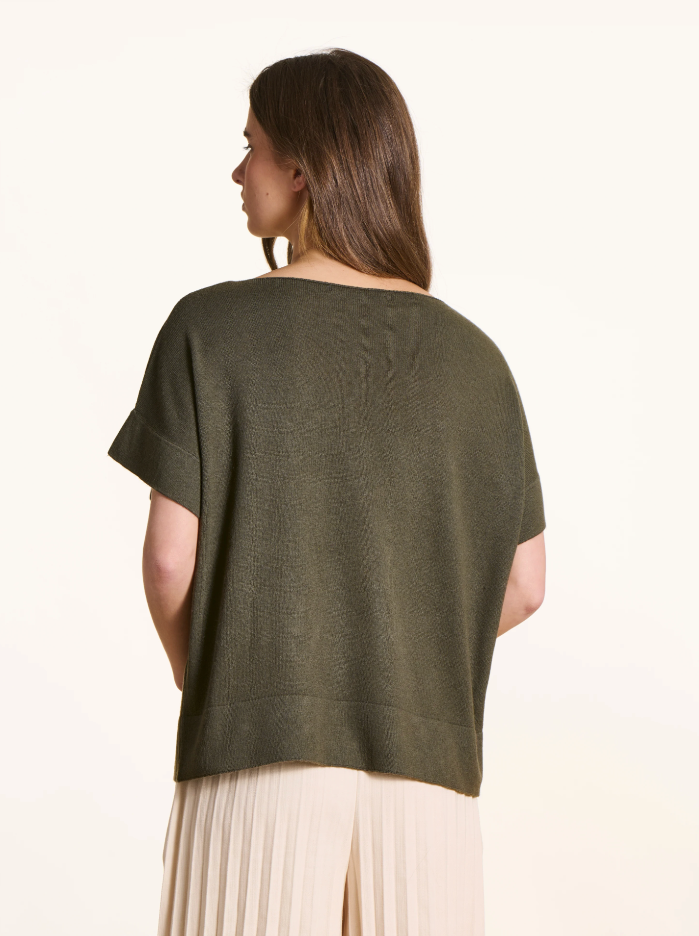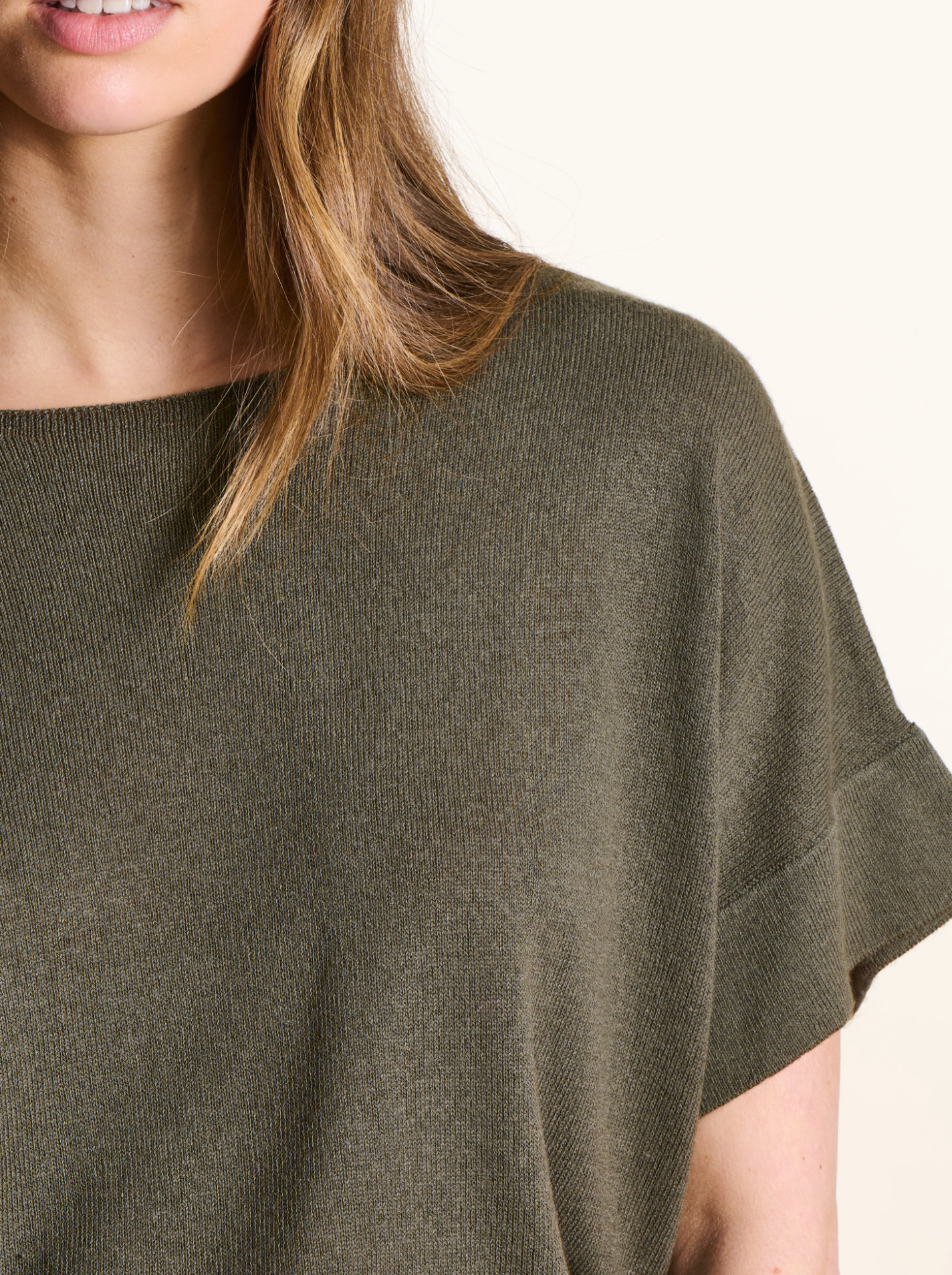 Fijngebreide trui met boothals en korte, vallende mouwen. Losse pasvorm.