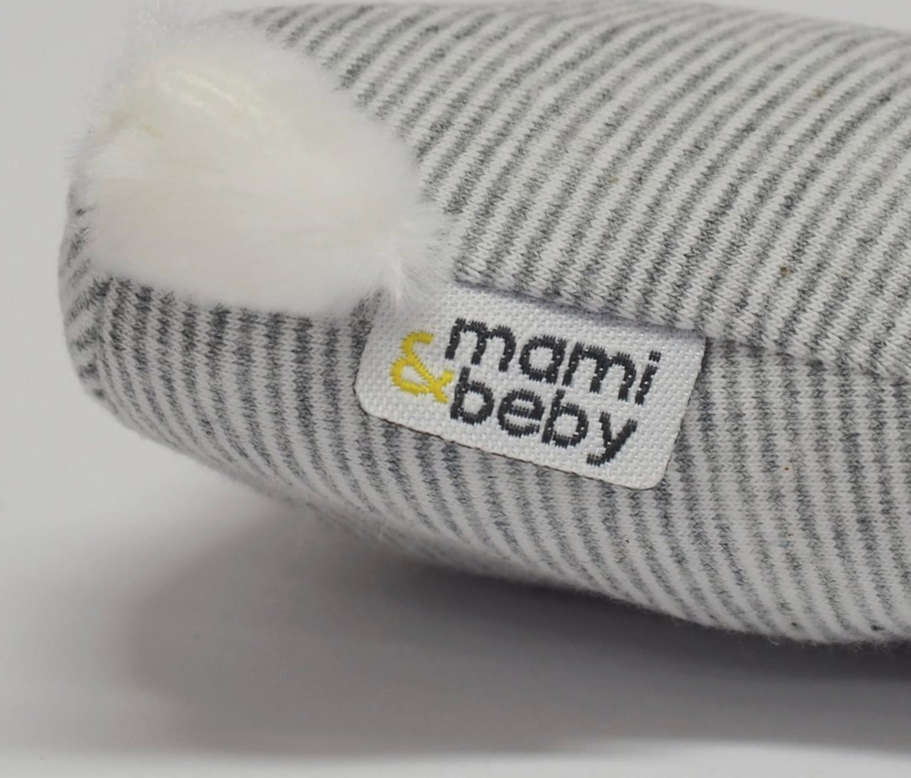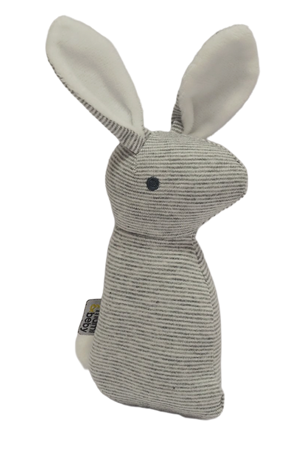 Een van zacht gestreepte katoenen tricot stof gemaakte rammelaar van Mami Beby. De rammelaar heeft pluizig staartje en knisperende oortjes. In de knuffel zijn belletjes verwerkt zodat het de kleine bij het bewegen van de rammelaar een geluidje laat horen.