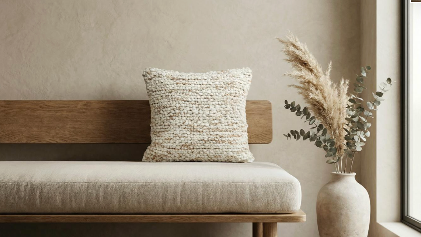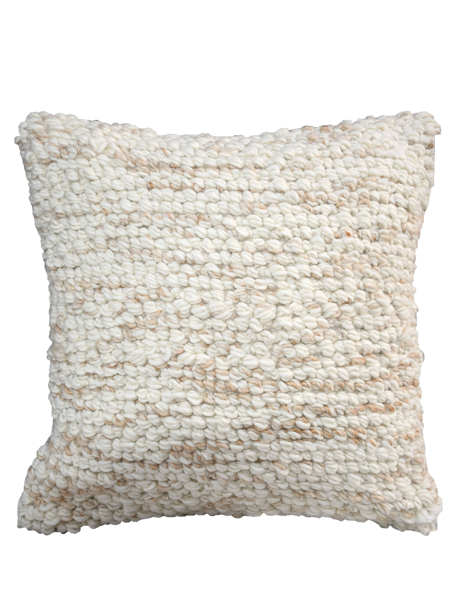 Sierkussen met bolletjes textuur in een combinatie van offwhite en beige wol. De achterzijde van het kussen is offwhite katoen.