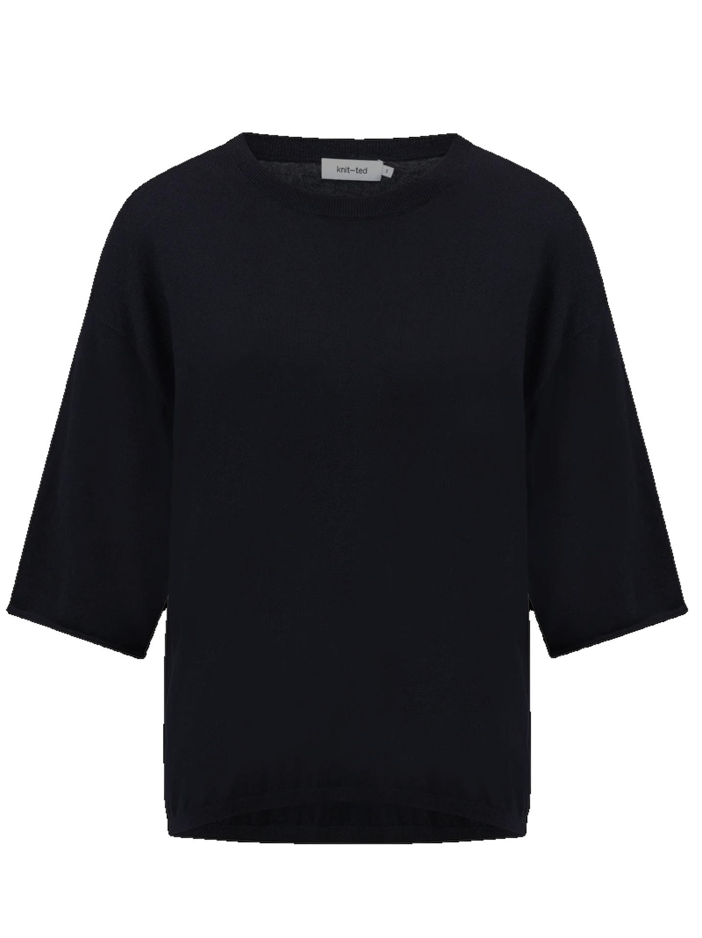 Merle heeft een luxe afwerking en mooie details. De top is onderdeel van de Peachskin capsule van het label Knit-Ted, items gemaakt van een stevige katoen blend met zachte zijde. Dat maakt dat Merle als gegoten zit op ieder lichaamstype. Haar driekwartsmouw, ronde halslijn en wijde fit dragen bij aan een nonchalante maar verfijnde uitstraling. Het favoriete detail? De omgekrulde zomen op de mouw.