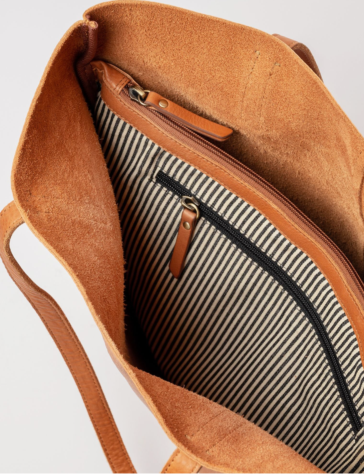 De binnenkant van de tas is uitgerust met een afsluitbare katoenen bag-in-bag om al je waardevolle spullen veilig kunt opbergen. De binnentas heeft de kenmerkende O My Bag zwart-witte strepen. Steekvakken en een groot ritsvak.