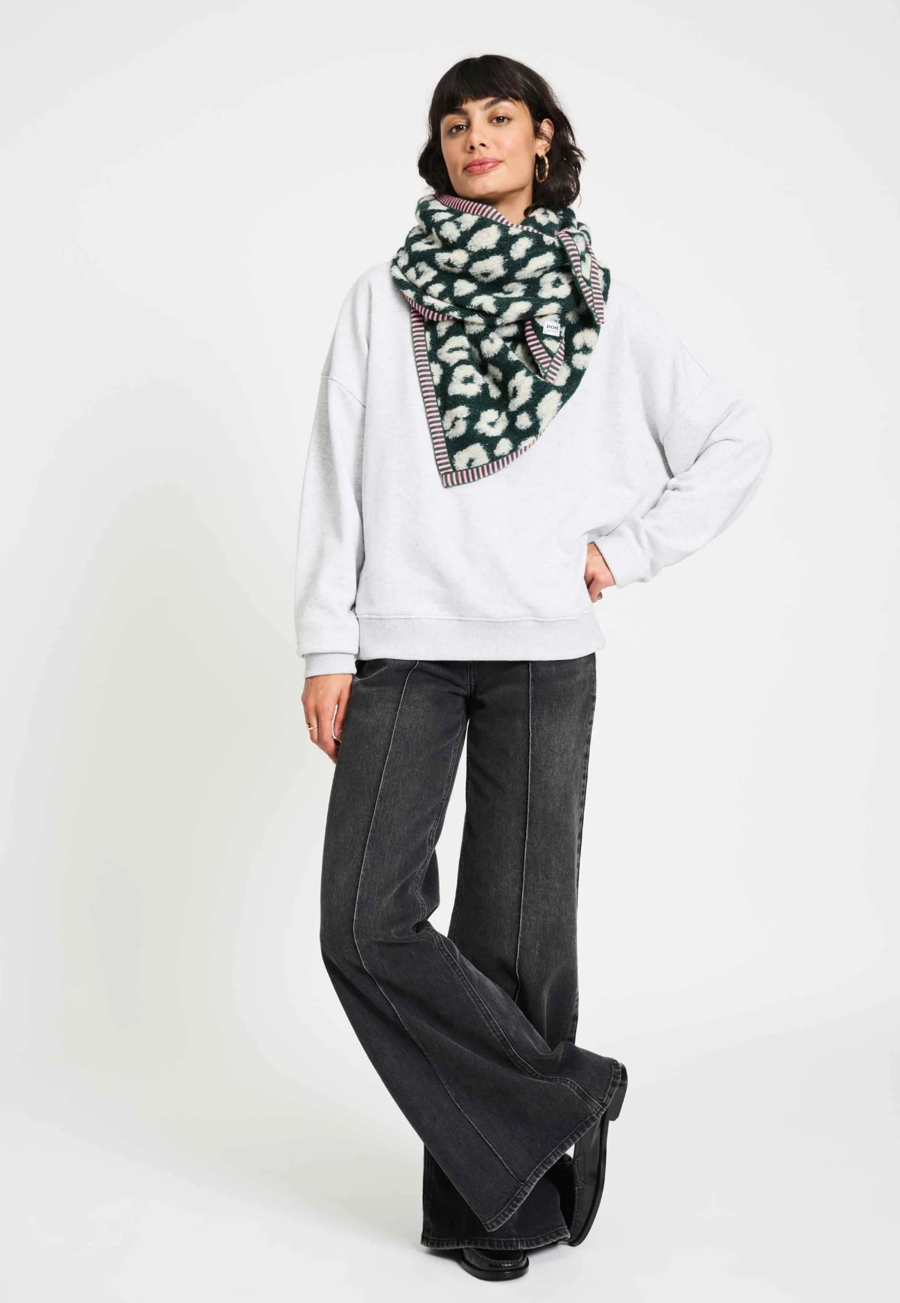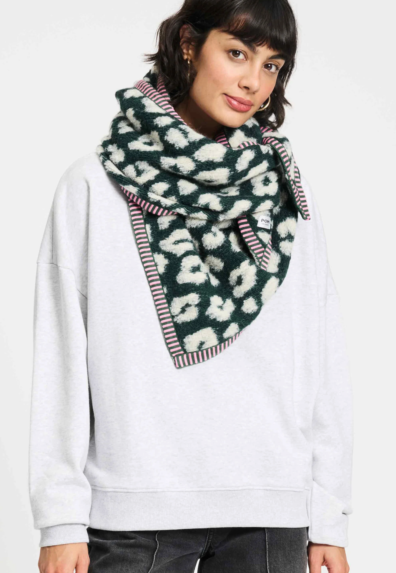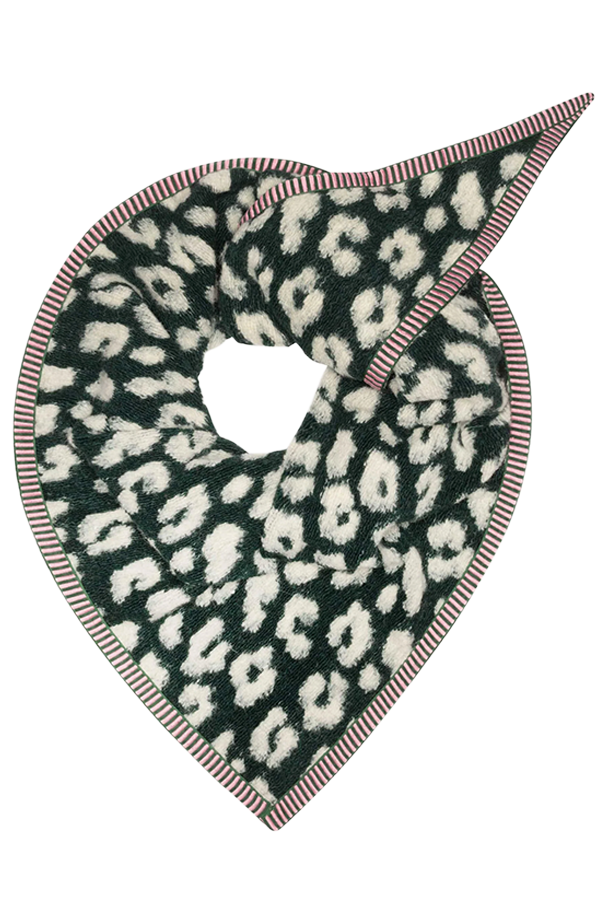 Deze donkergroene jacquard sjaal met ecru panterprint en roze-groen gestreepte bies geeft je look instant karakter.