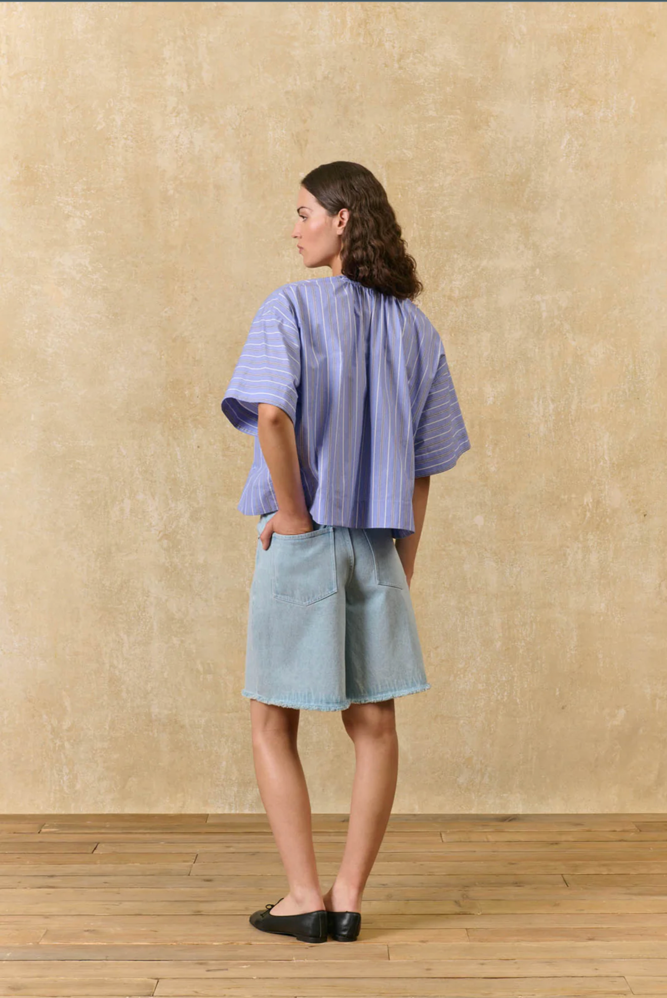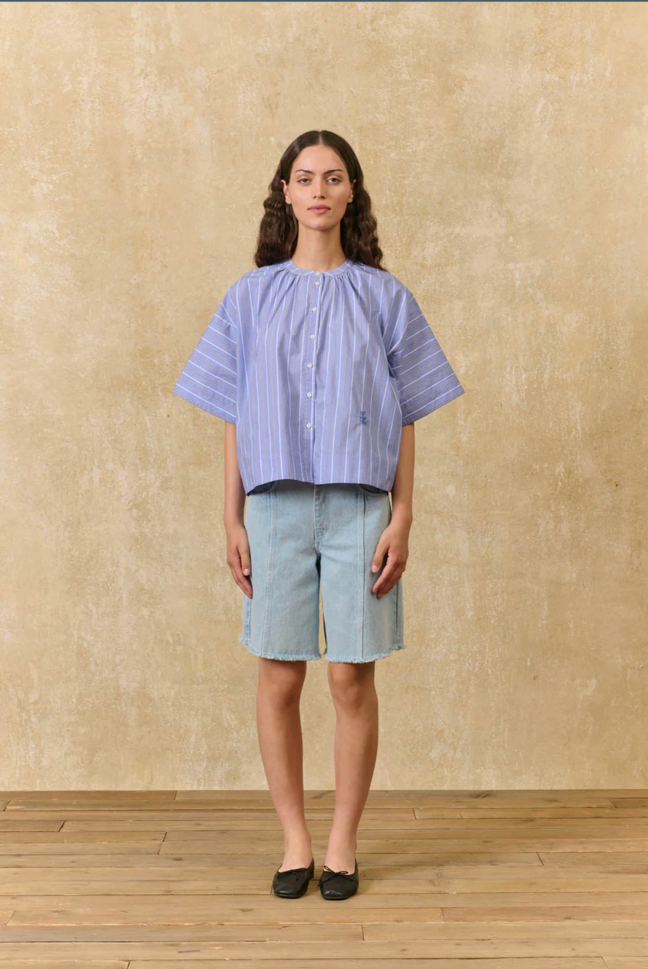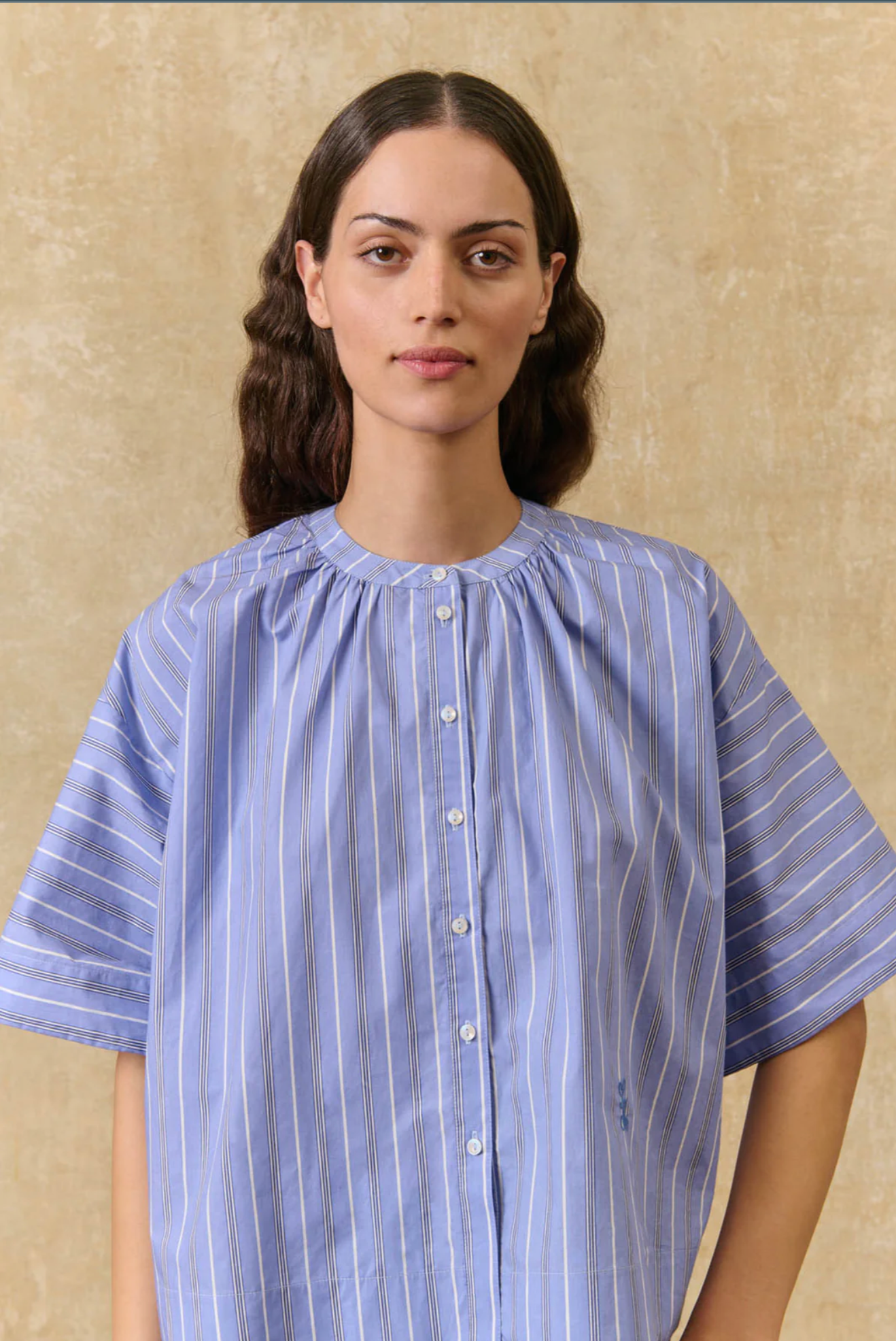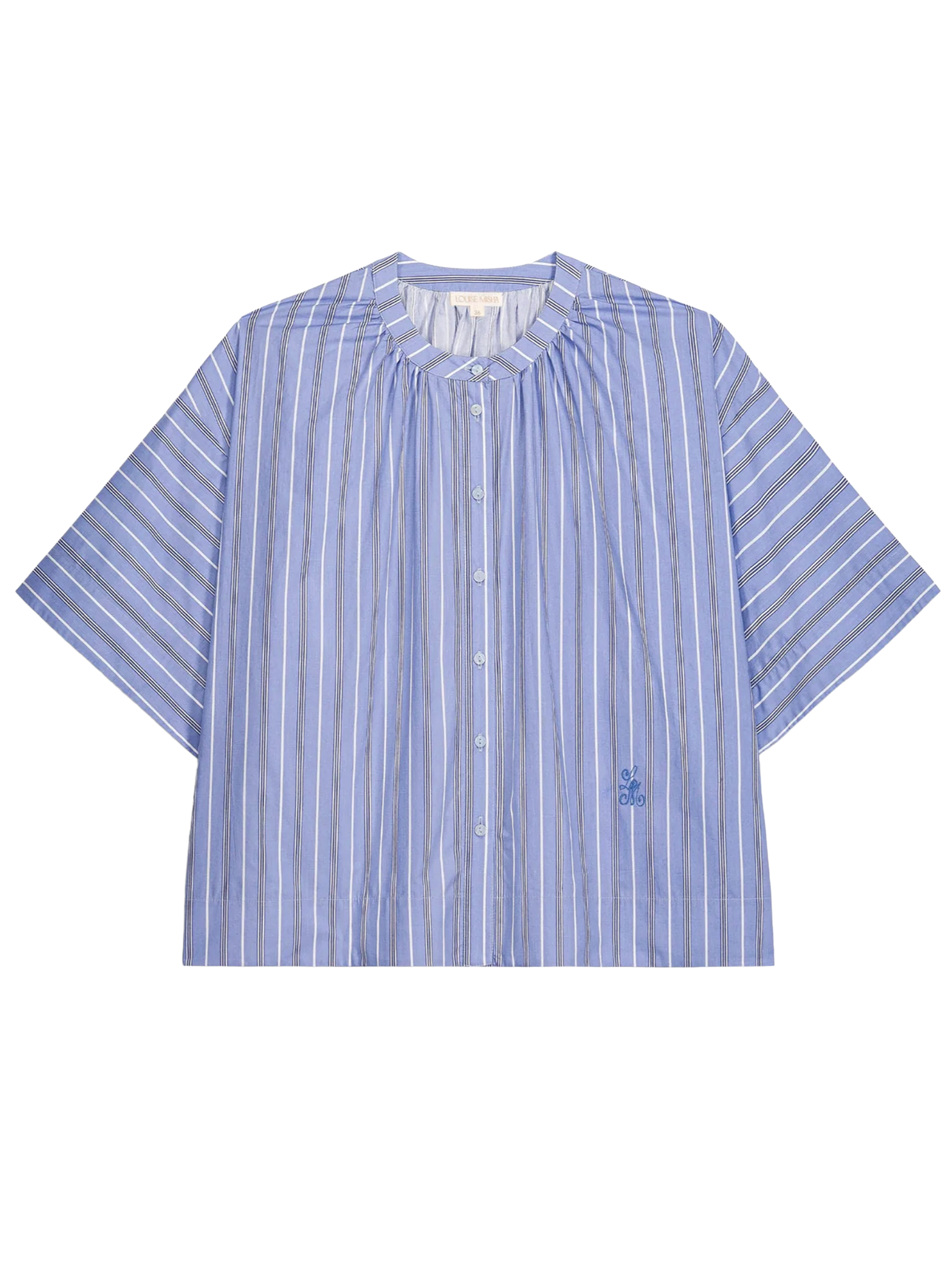 Gestreepte blouse van katoenen poplin. Ronde hals met geplooid volume rond de halslijn. Volledig doorgeknoopt aan de voorkant, van boven tot onder. Het Louise Misha-monogram is aan de voorkant onderaan geborduurd. Lage armsgaten en losse mouwen tot aan de elleboog. Relaxte pasvorm. Brede zoom aan de onderkant.