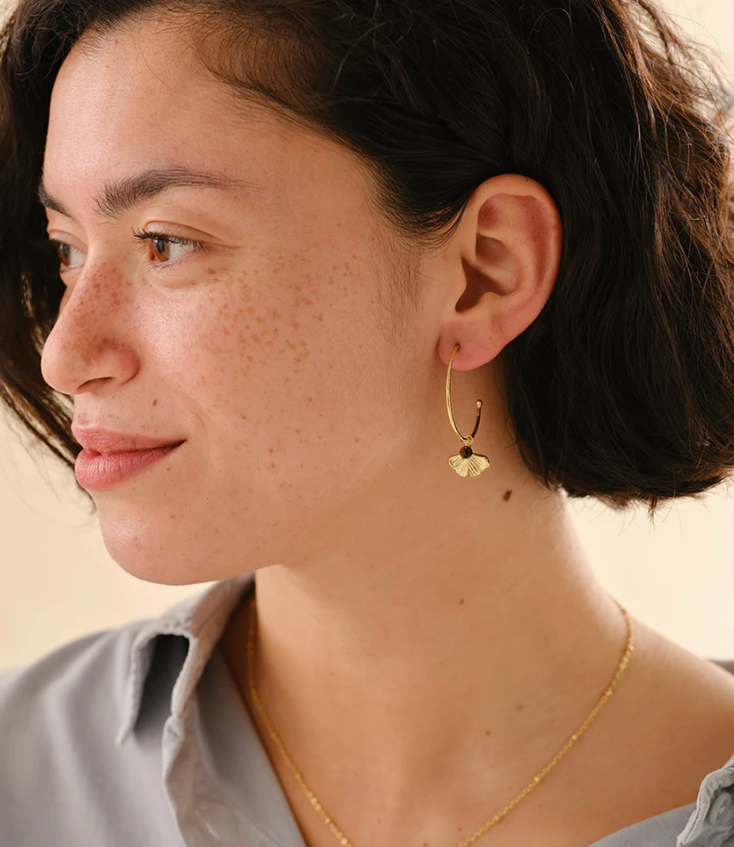 Gold-plated hoops of hope, luck & strength. De symbolische betekenis van de Solidarity Tijgeroog Oorbellen is minstens zo mooi als de oorbellen zelf. Driekwart ‘hoops’ met verfijnde hangers van mini-tijgeroog en verguld ginkgo-blad maken een trendy statement met betekenis.