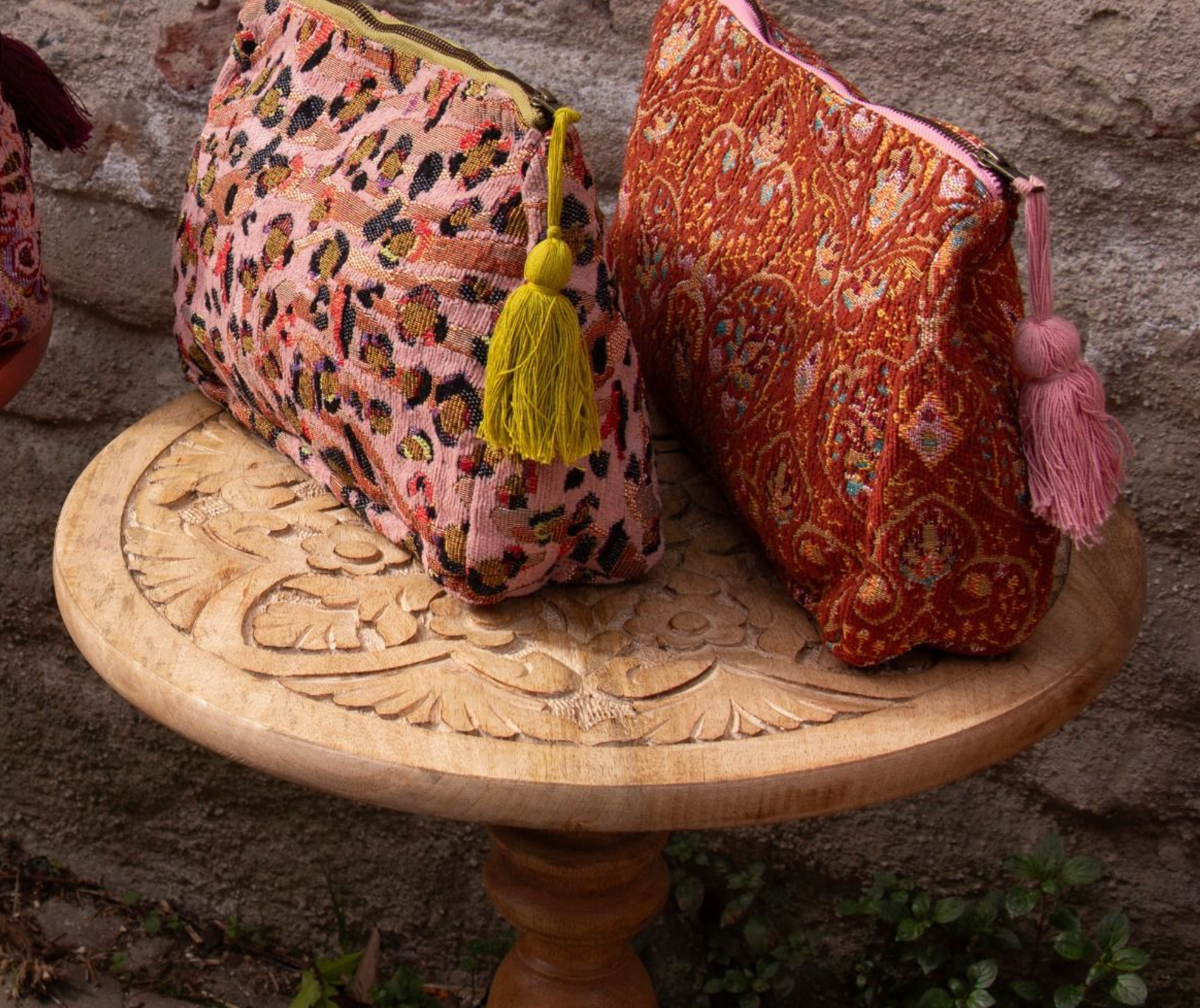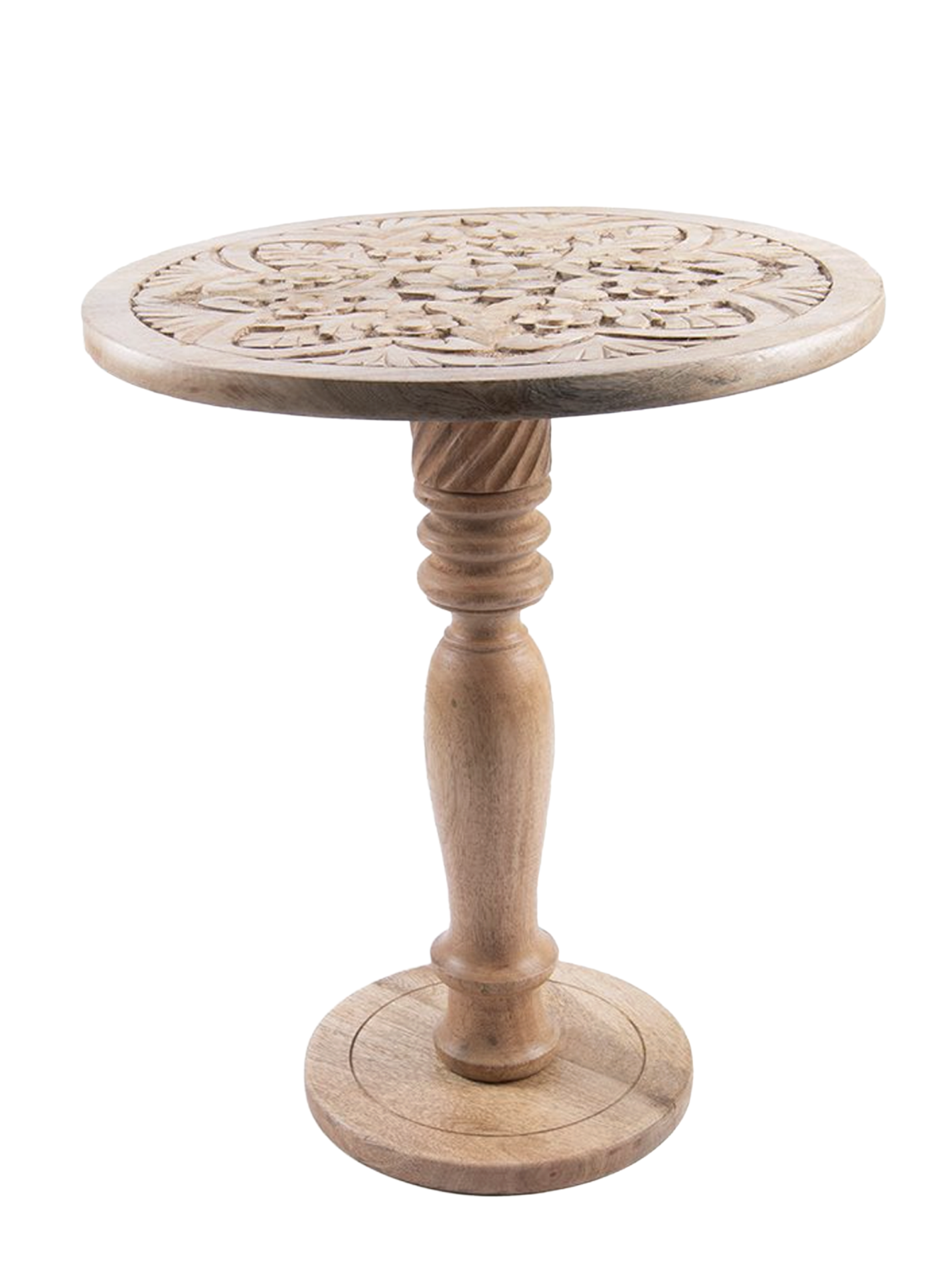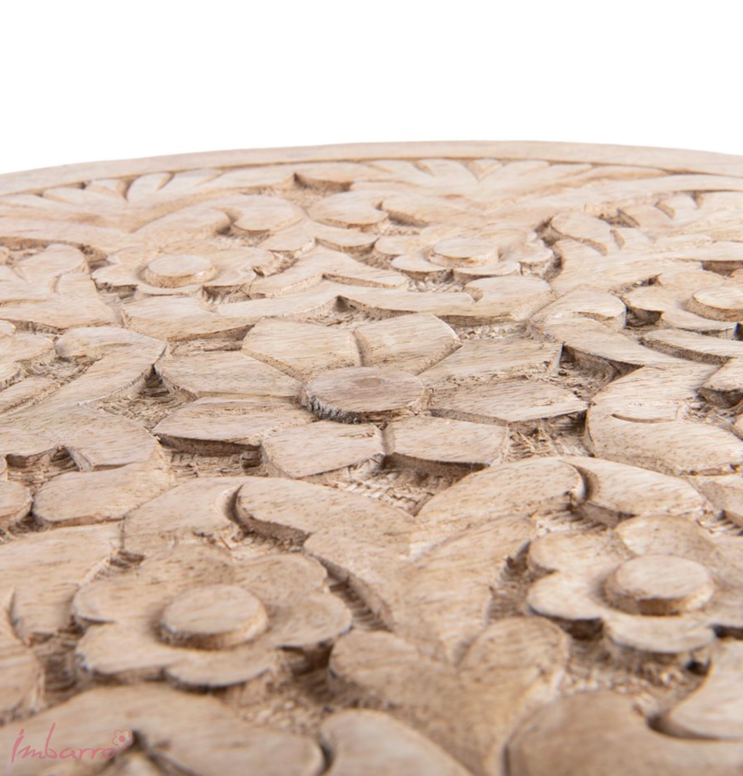 Deze ronde houten bijzettafel van robuust hout is niet alleen functioneel maar ook prachtig decoratief. Het blad van de tafel heeft een prachtig met de hand bewerkt bloemendessin.