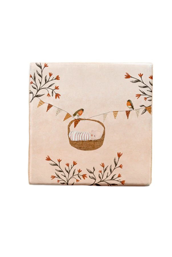 Handgemaakt tegeltje met een lieve illustratie van een wiegje met baby en roodborstjes. Een mooi wandtegeltje als kraamcadeautje. Of als decoratie in de babykamer.
