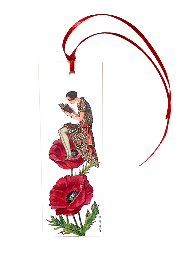 Cheerful bookmark with ribbon featuring a collage. Made on 350 gsm Tintoretto Gesso paper in A7 size. 5.2 x 14.8 cm / 2 x 8.3 inches. Tintoretto Gesso is an uncoated paper with a beautiful texture reminiscent of watercolor paper. The paper is lightly off-white. The texture remains visible in the image, giving it a classic appearance.