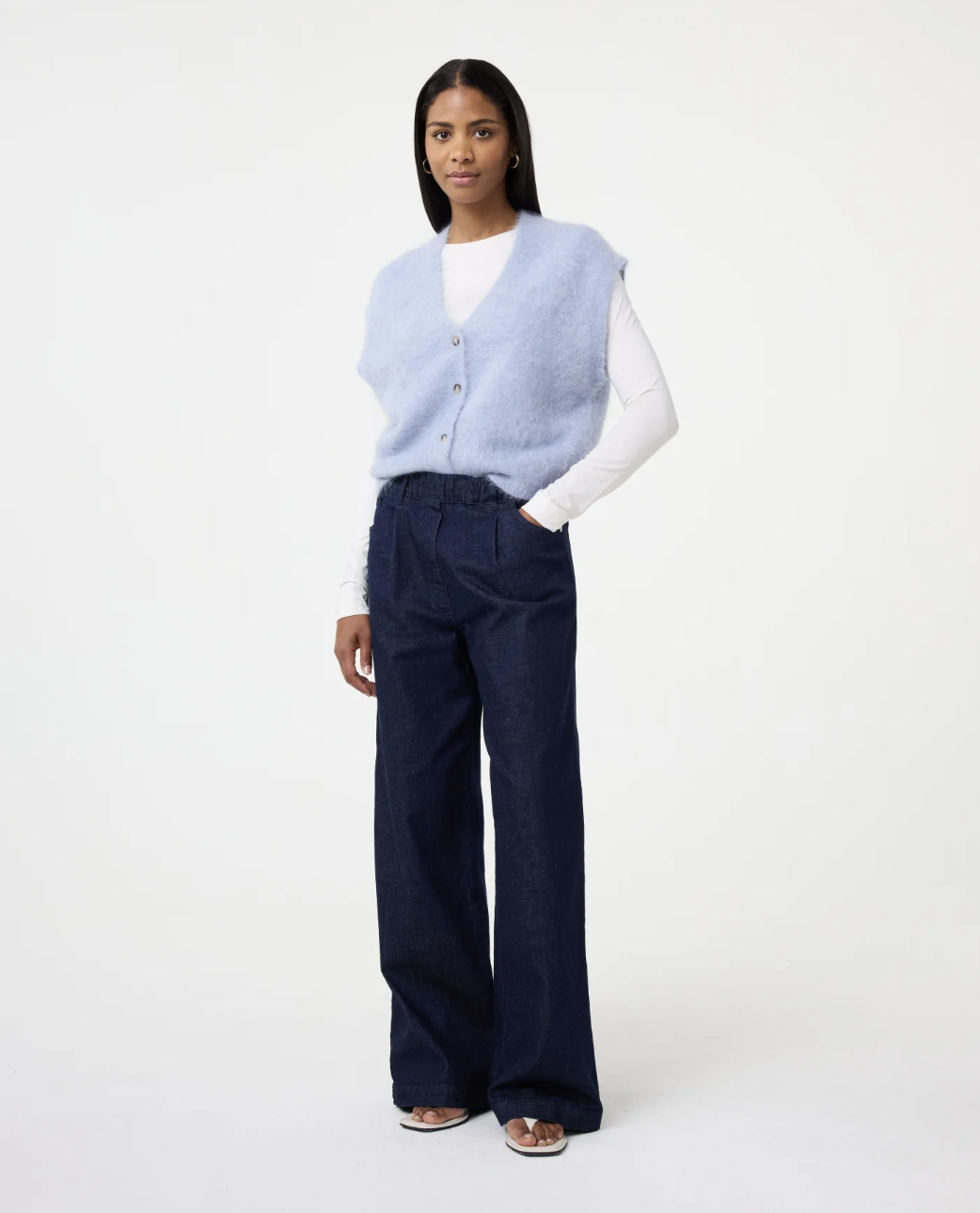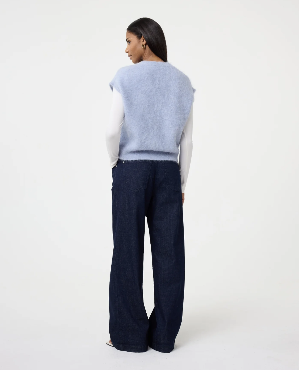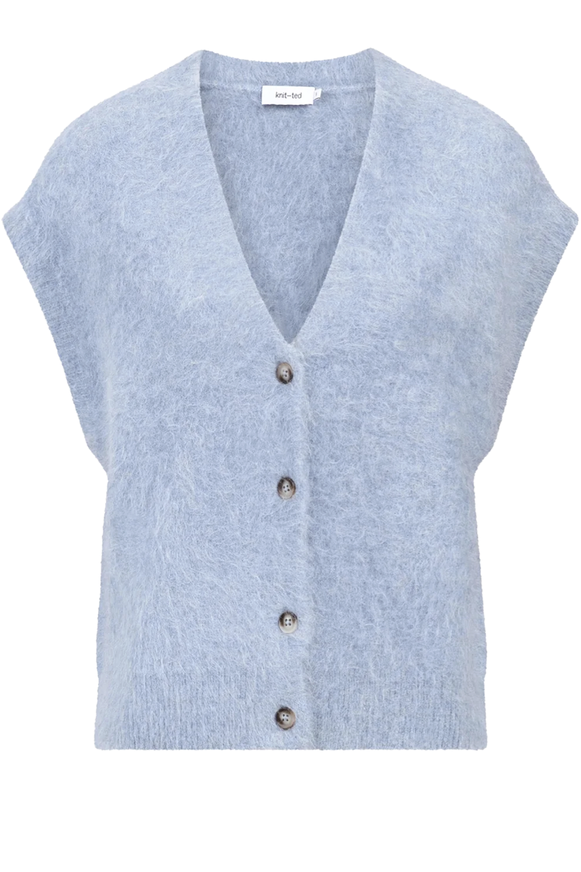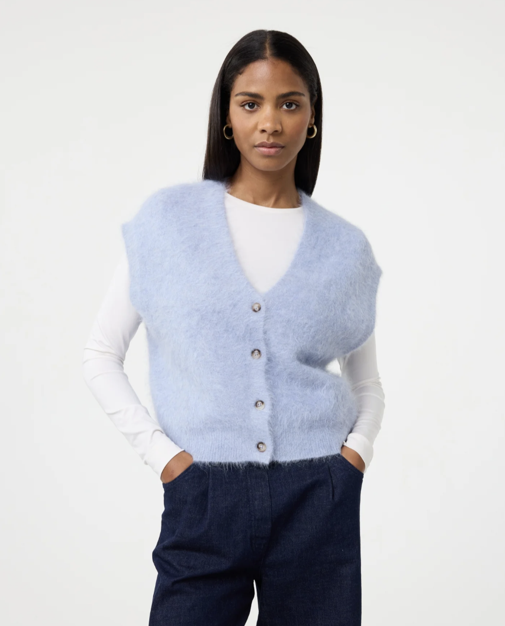 The Constanze Cardigan is sleeveless with a V-neck, featuring a soft and luxurious hairy knit. Her loose fit and button fastening through the front make her effortlessly chic. Crafted from super-premium alpaca wool, she exudes a high-end look with minimal effort. She's the perfect warm addition to elevate any outfit.
