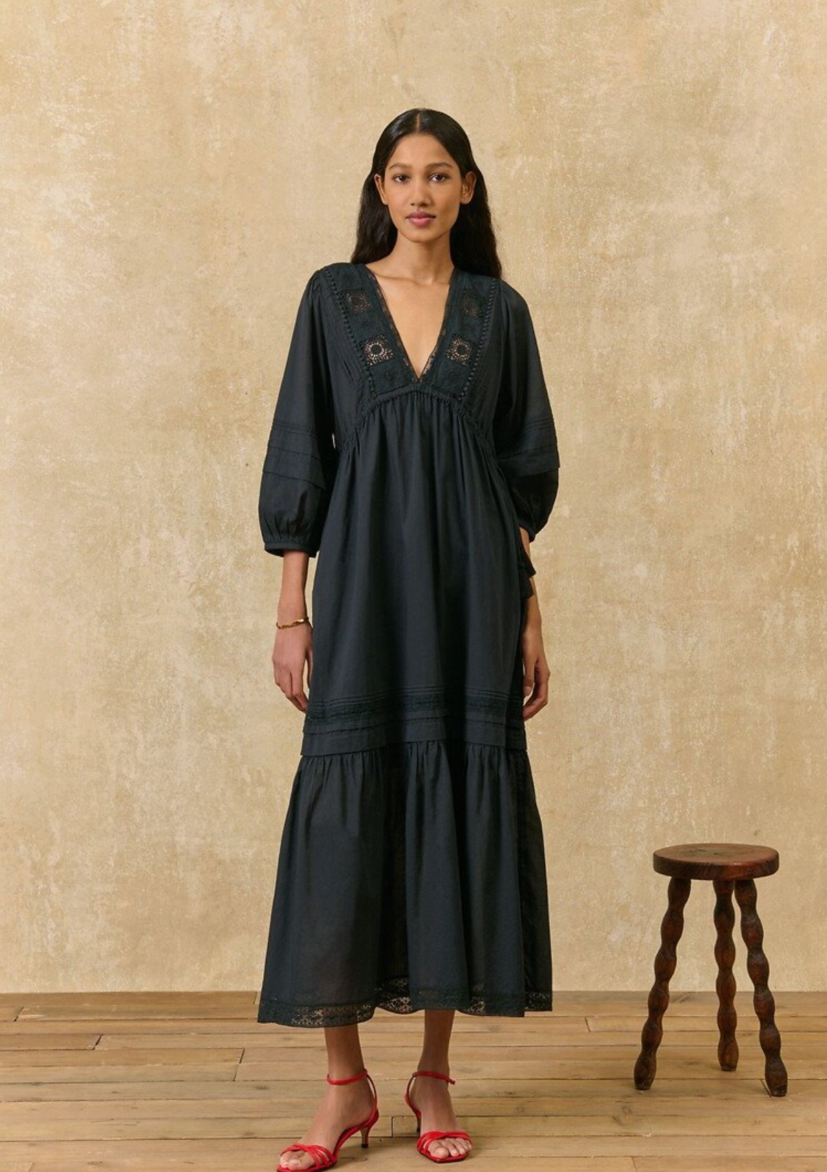 Flowy summer dress made of soft, breathable cotton with a V-neck detail, light puff sleeves, lace inserts, and subtle pleats.