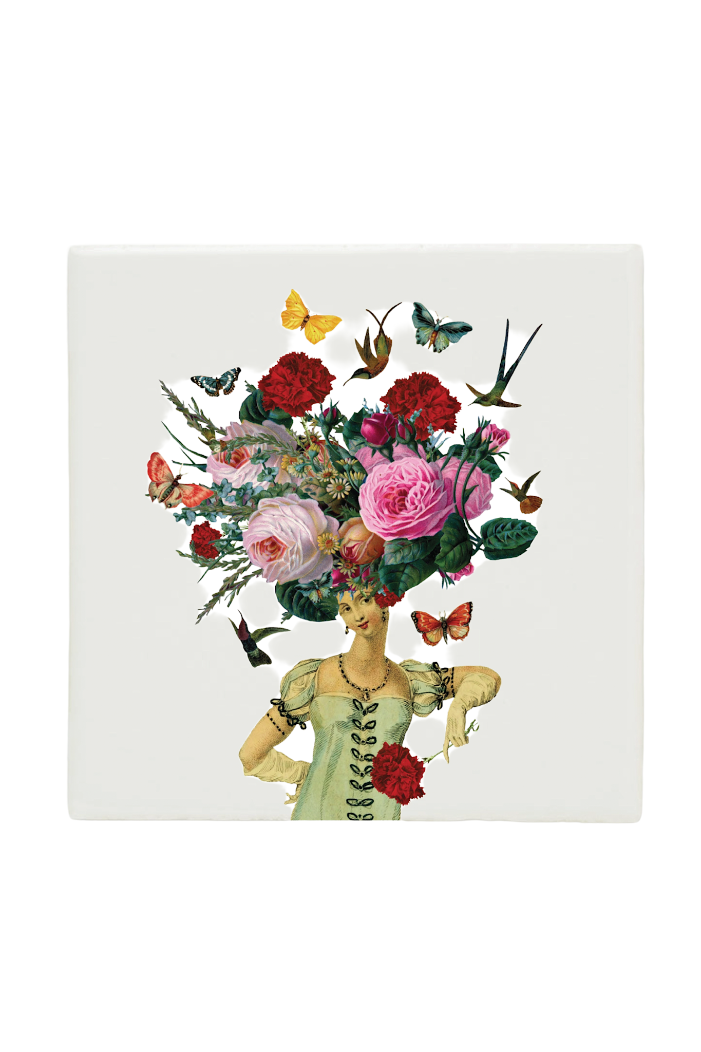 Cheerful tile with a collage made from botanical and vintage prints, made on Fries 'witje' with a hanging hook on the back for attachment.