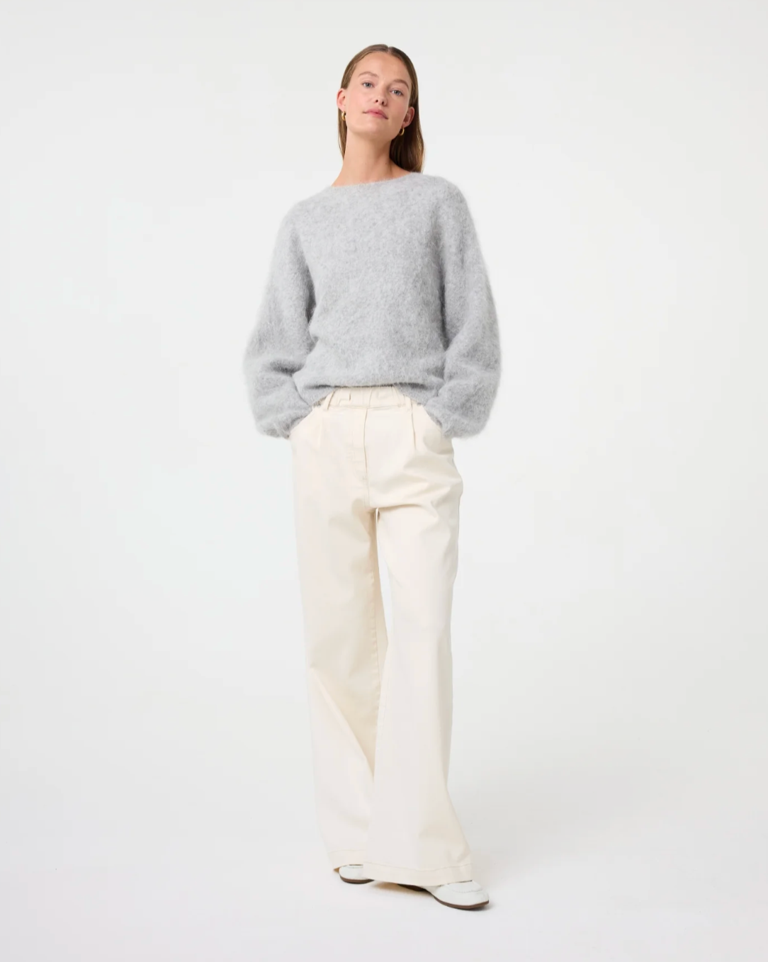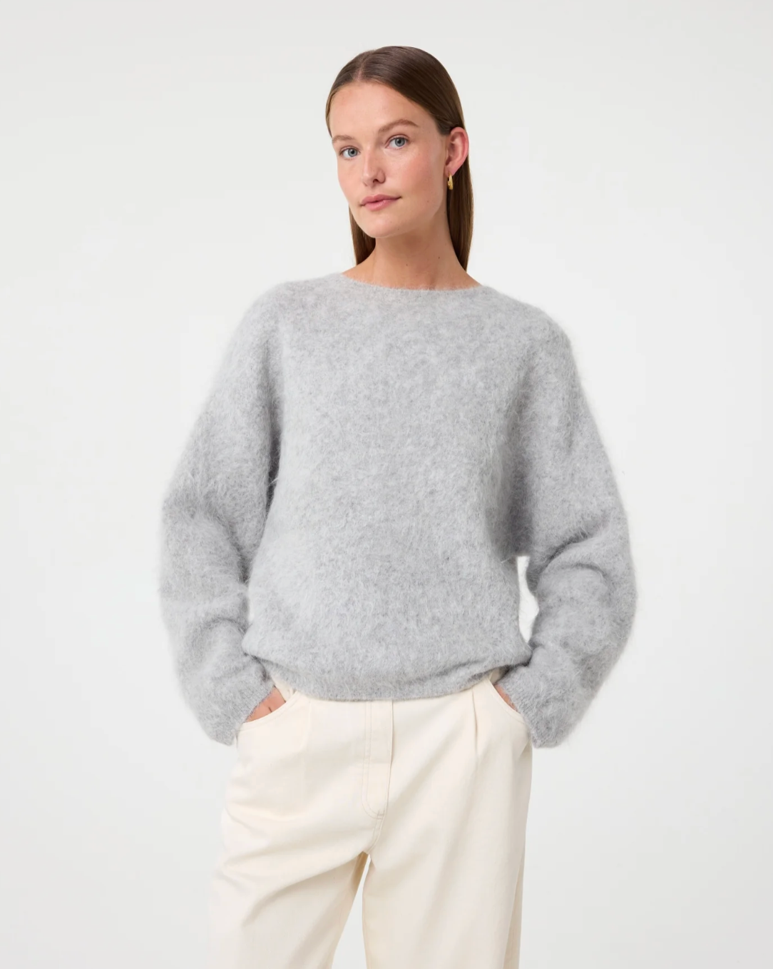 There’s something regal about Amalia. Maybe it’s the soft halo of the alpaca blend, or the way the boat neckline sits just so. She’s understated, but unmistakably refined. The relaxed fit keeps her wearable, the texture adds quiet drama. Slip her on, and feel a little elevated without trying.