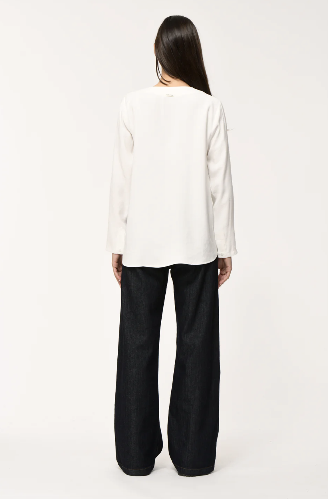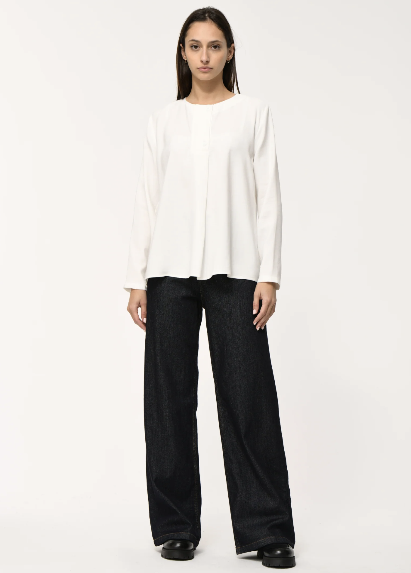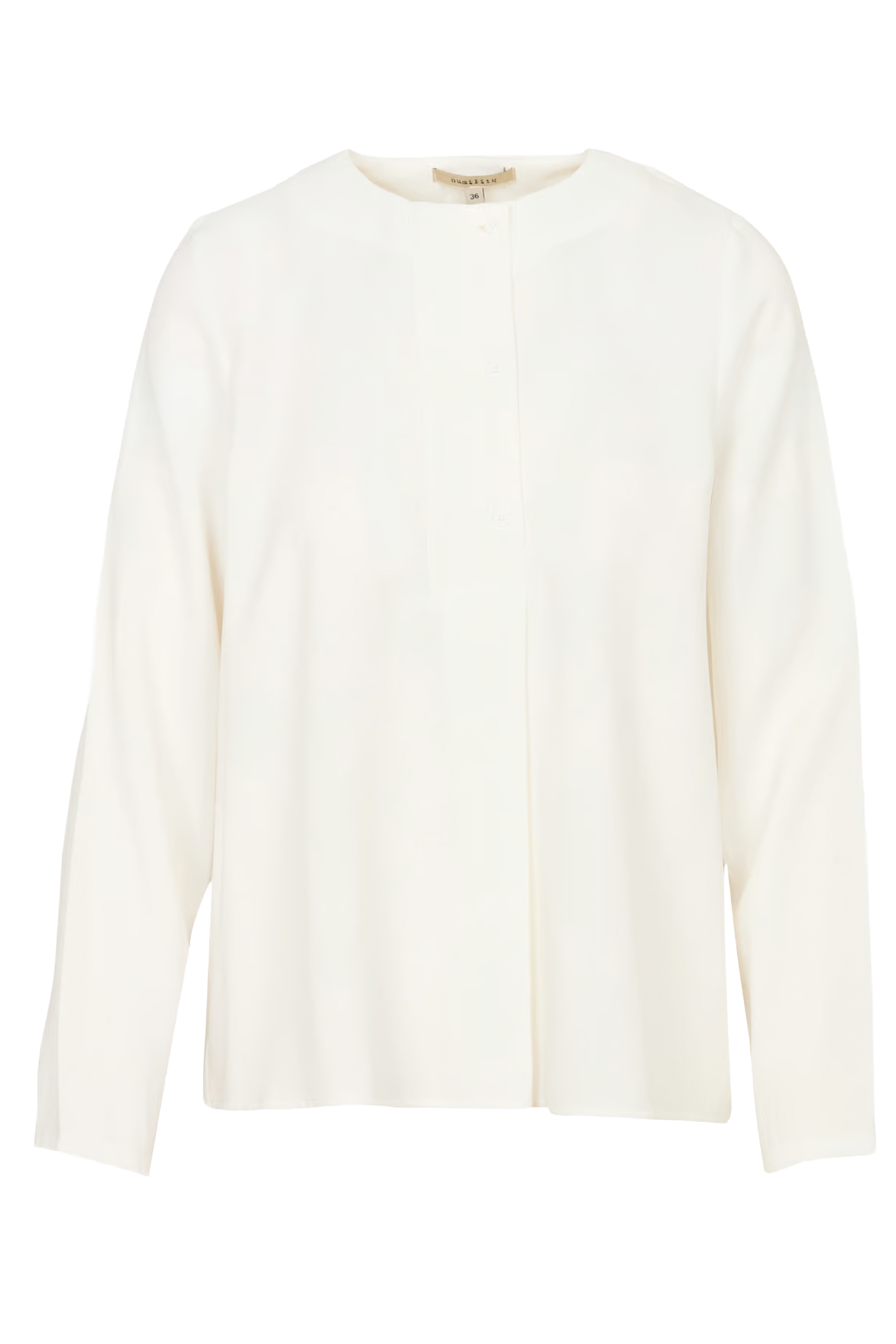 Top with a straight fit and round neckline. Button closure with 2 buttons and a slightly rounded hem. Longer at the back.