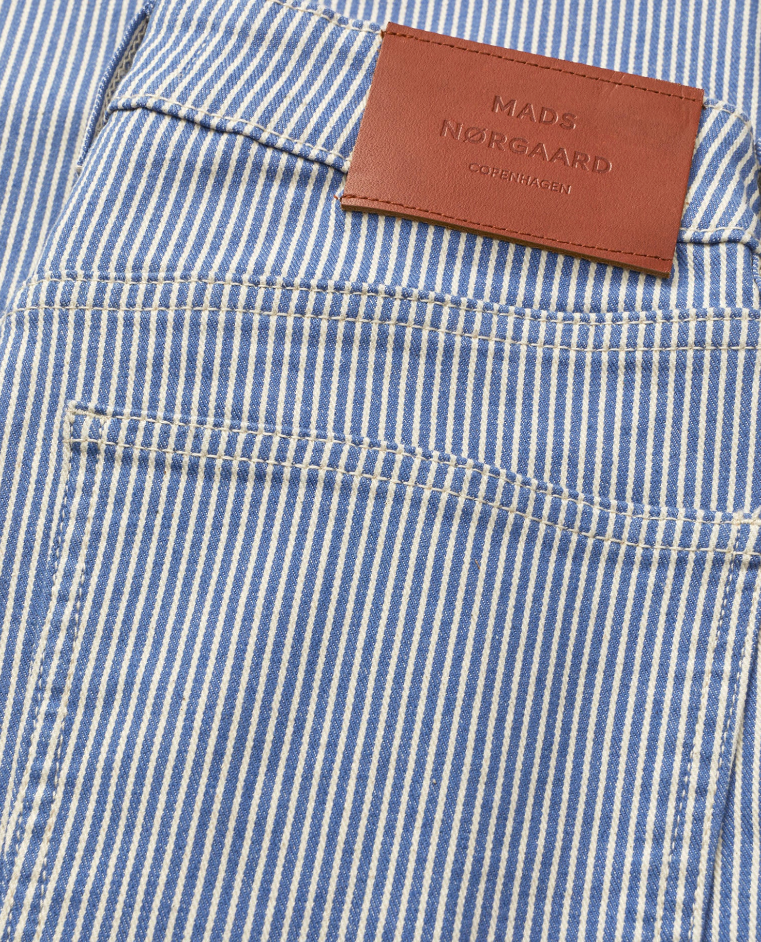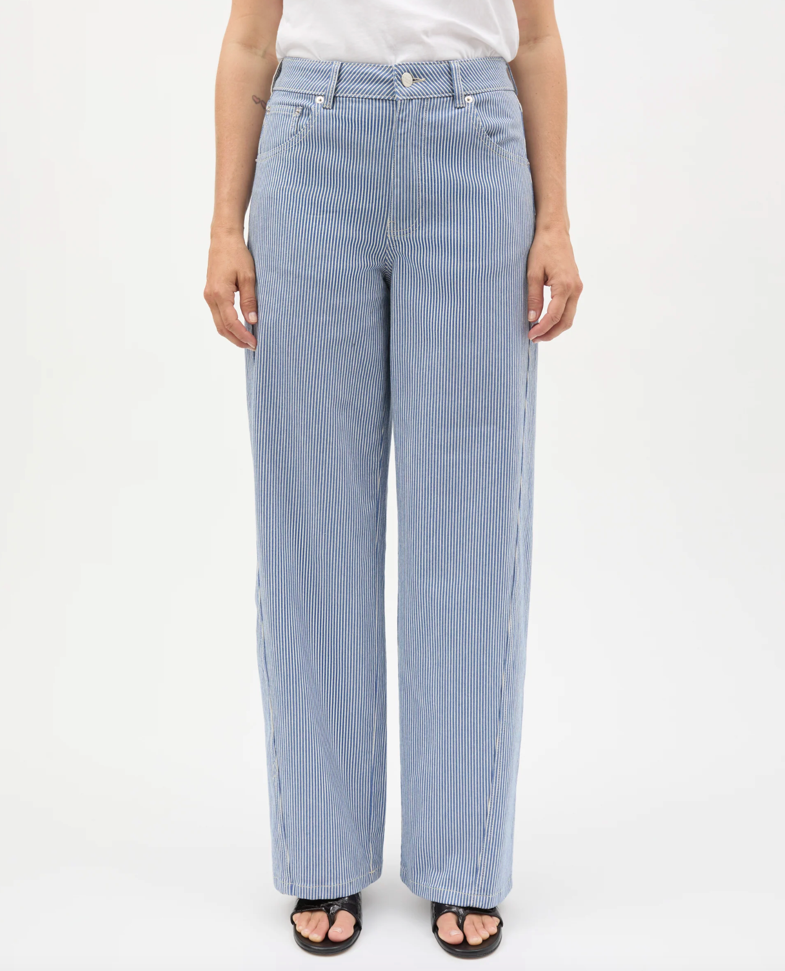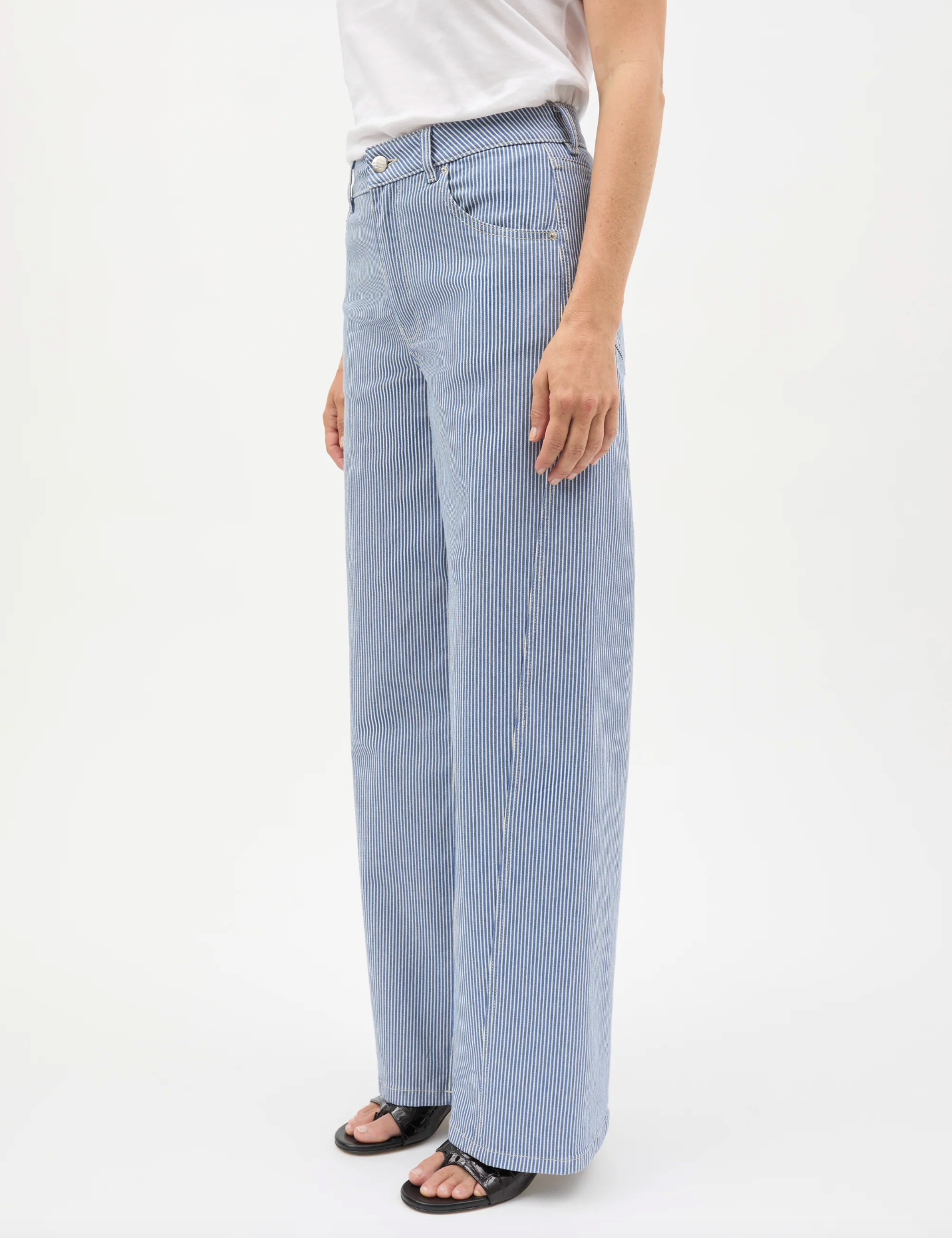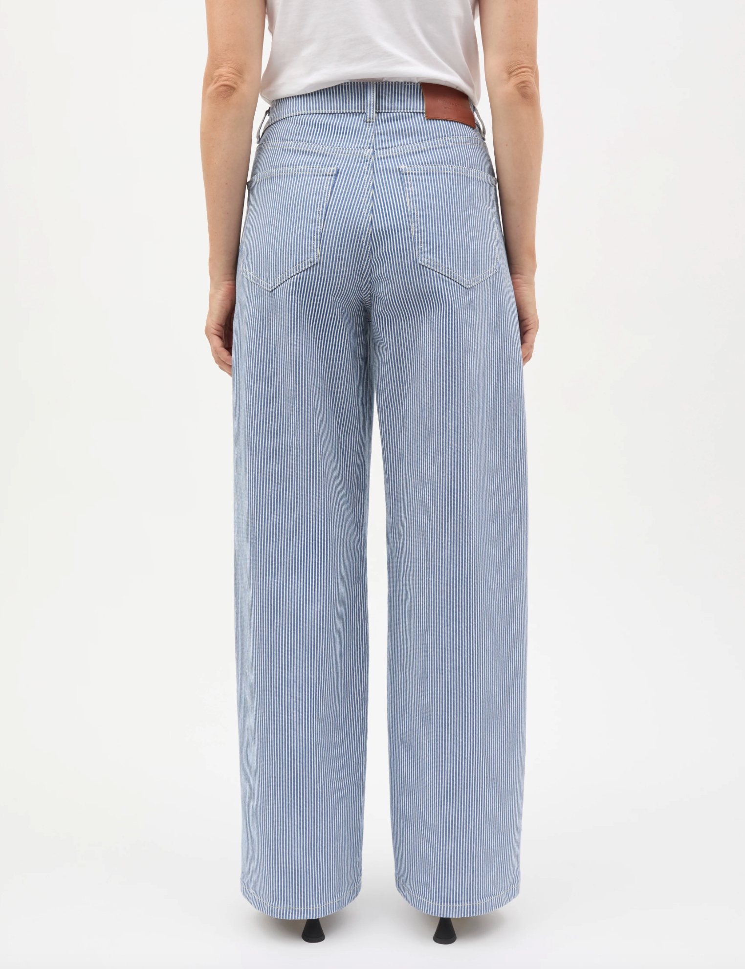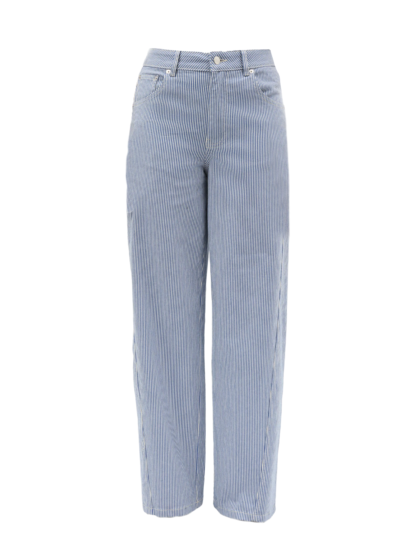 Barrel jeans in striped denim with a classic five-pocket design, belt loops at the waist, mid-rise and a defined waistband. The twisted seams create a clean, elegant drape.