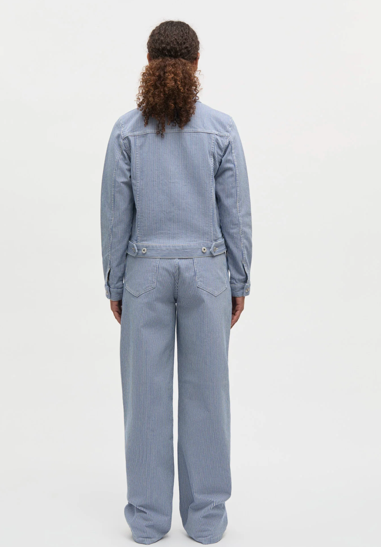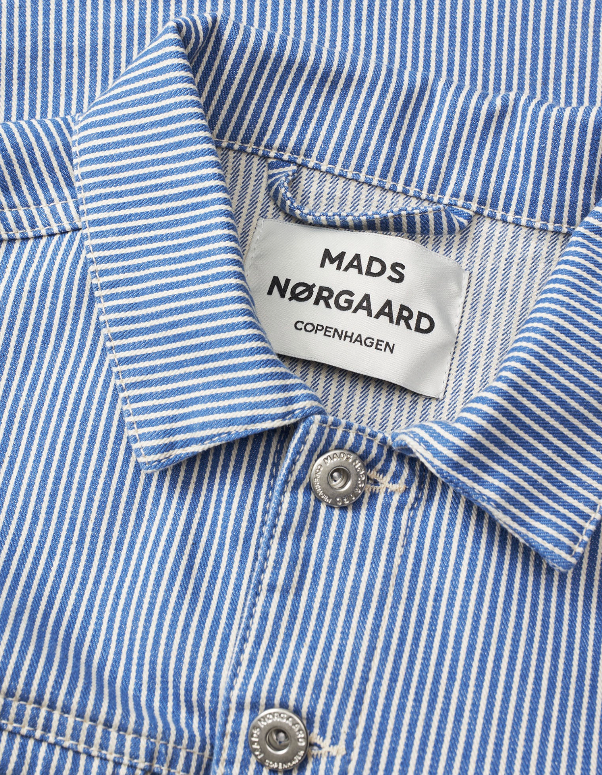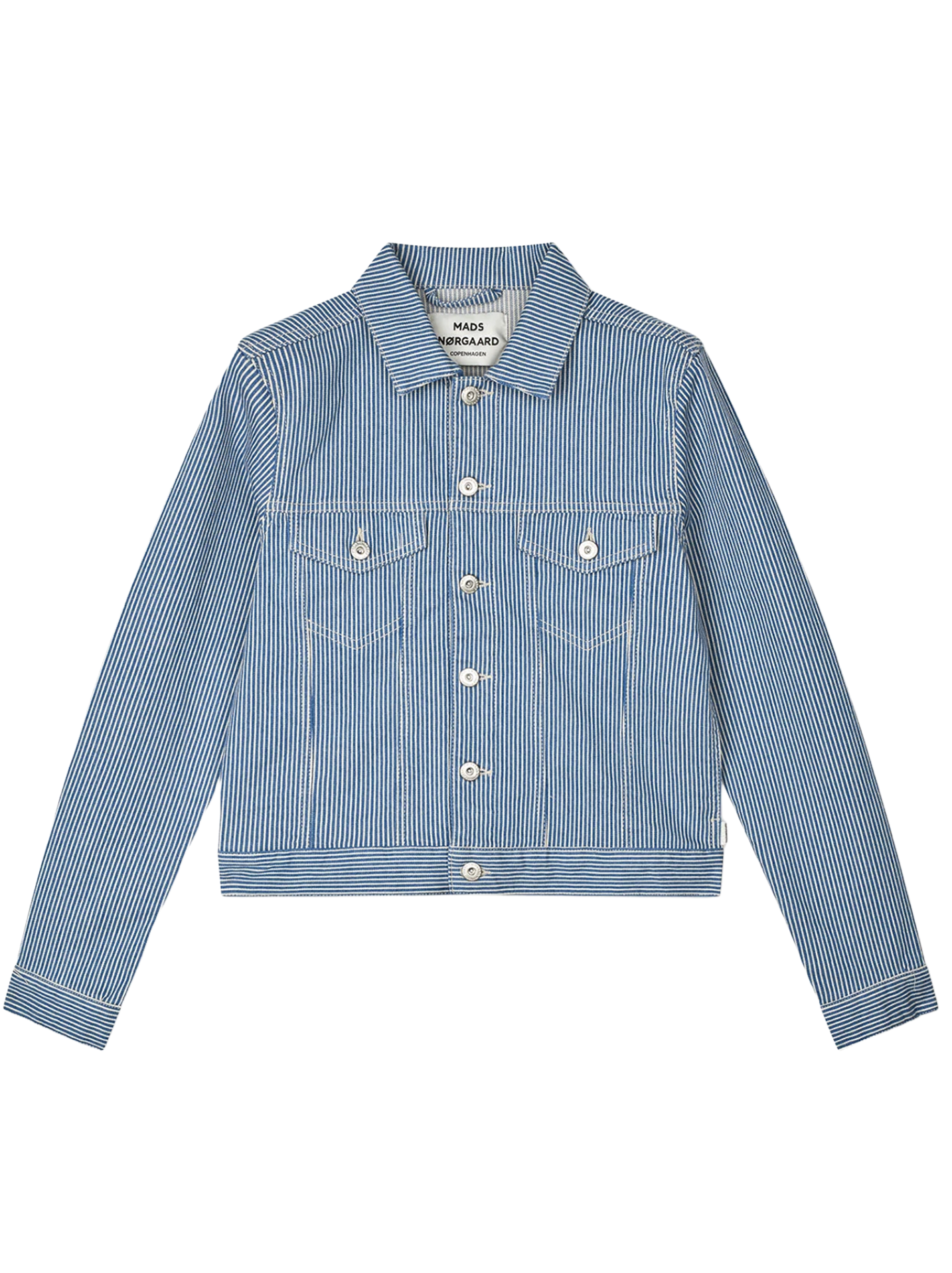 Short, structured jacket in striped denim with a collar, visible button fastening, shaped chest pockets and striped details.