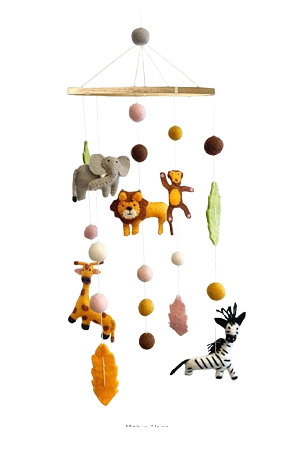 African animals mobile! Perfect as a maternity or birthday gift. Made of felt with 100% New Zealand wool. FairMade in Nepal.