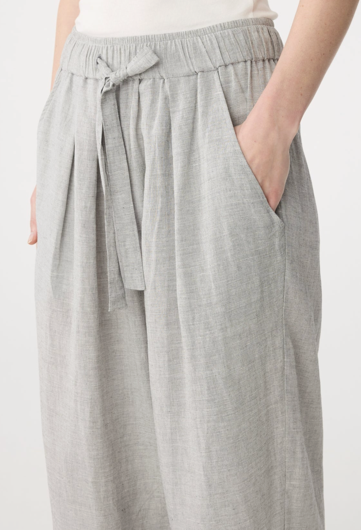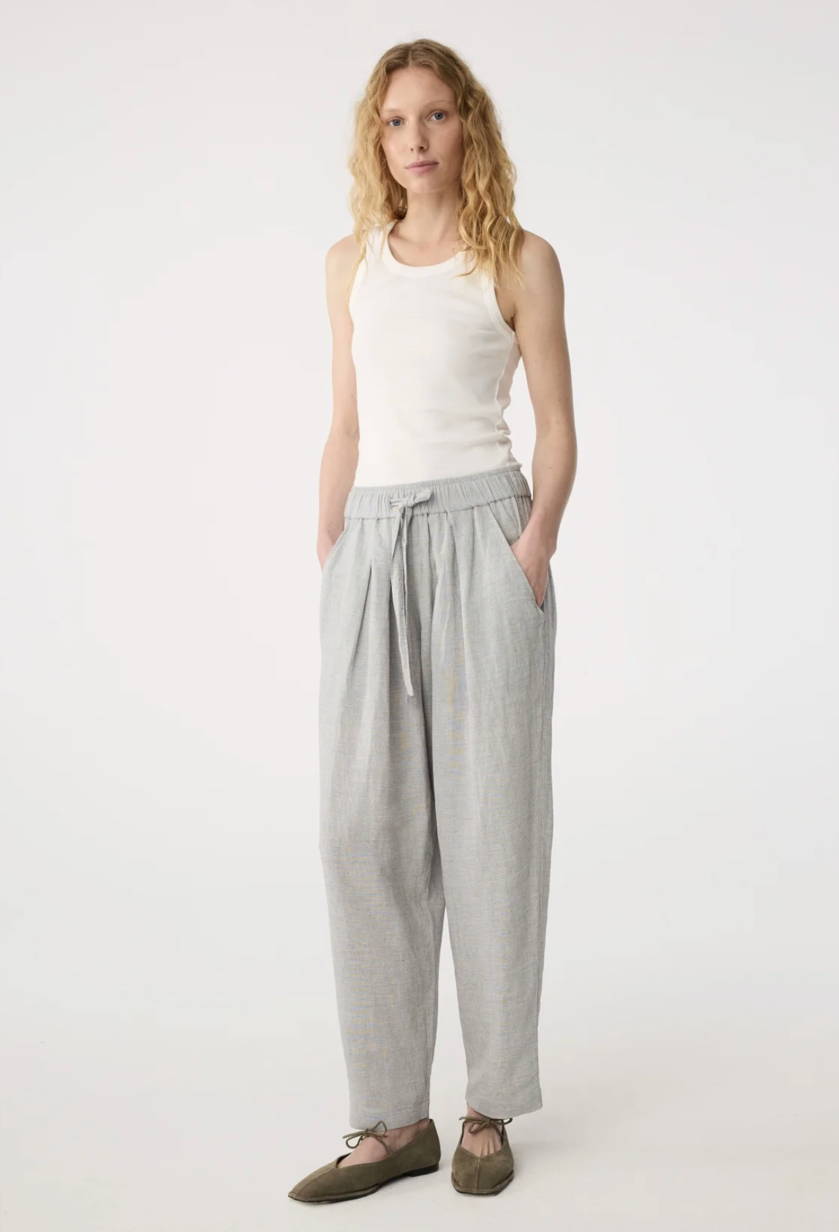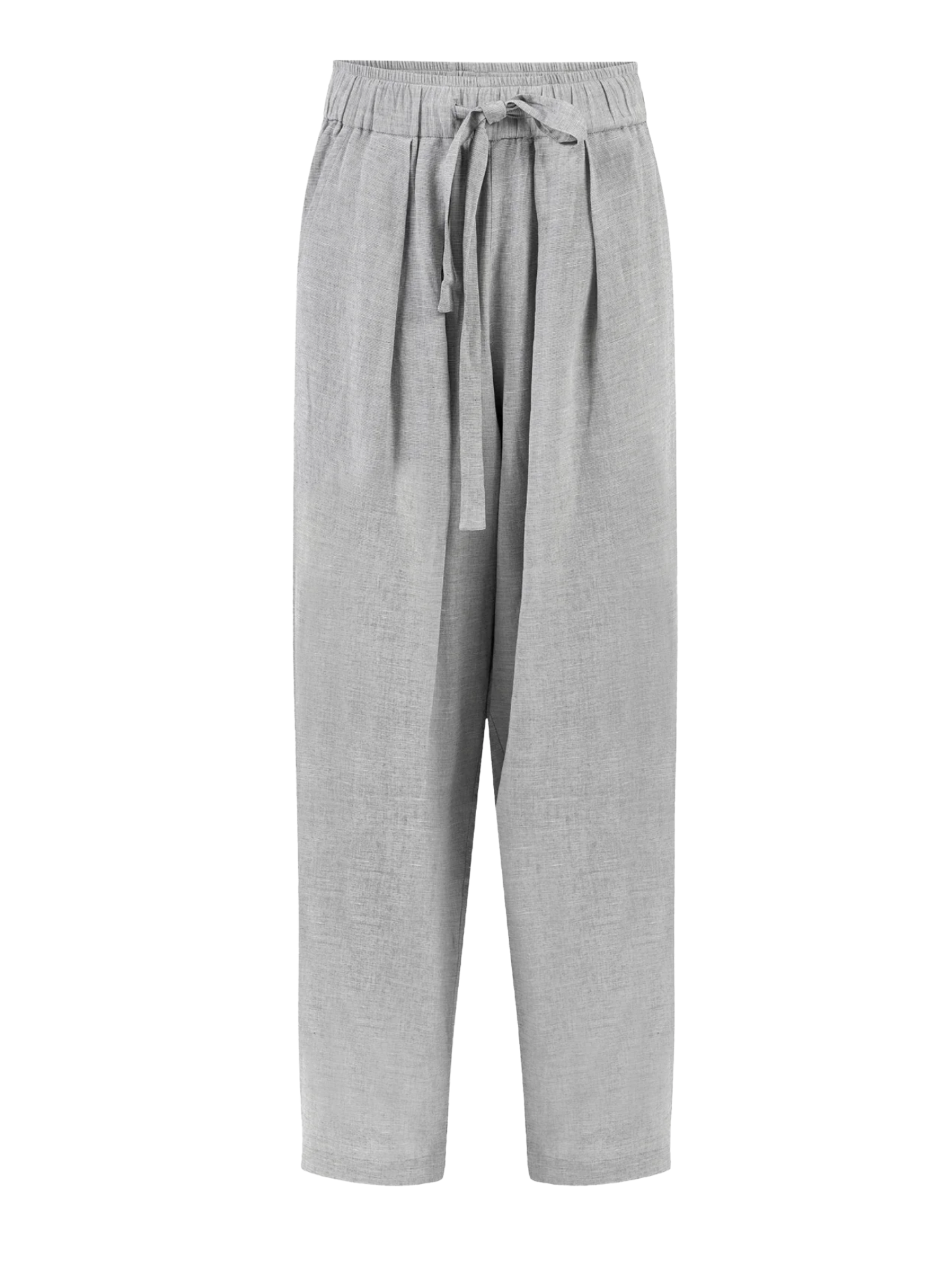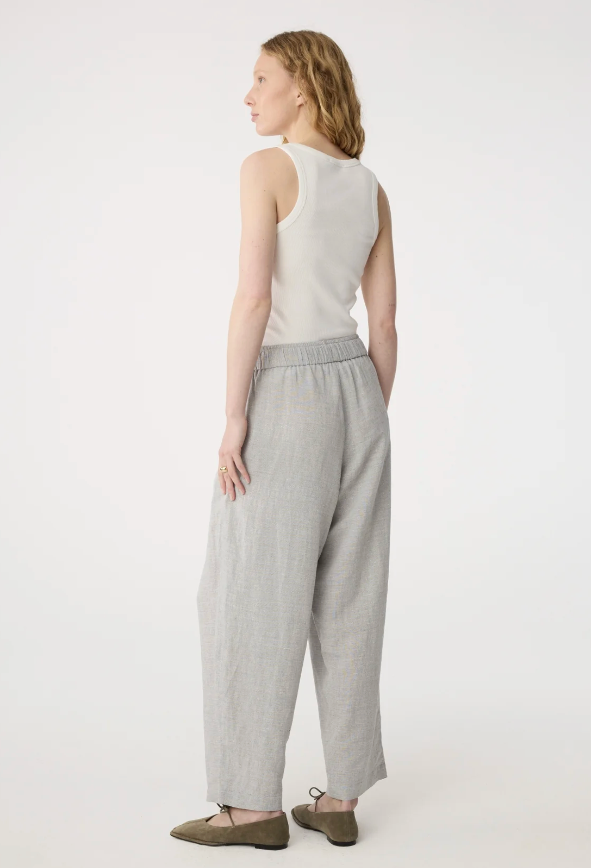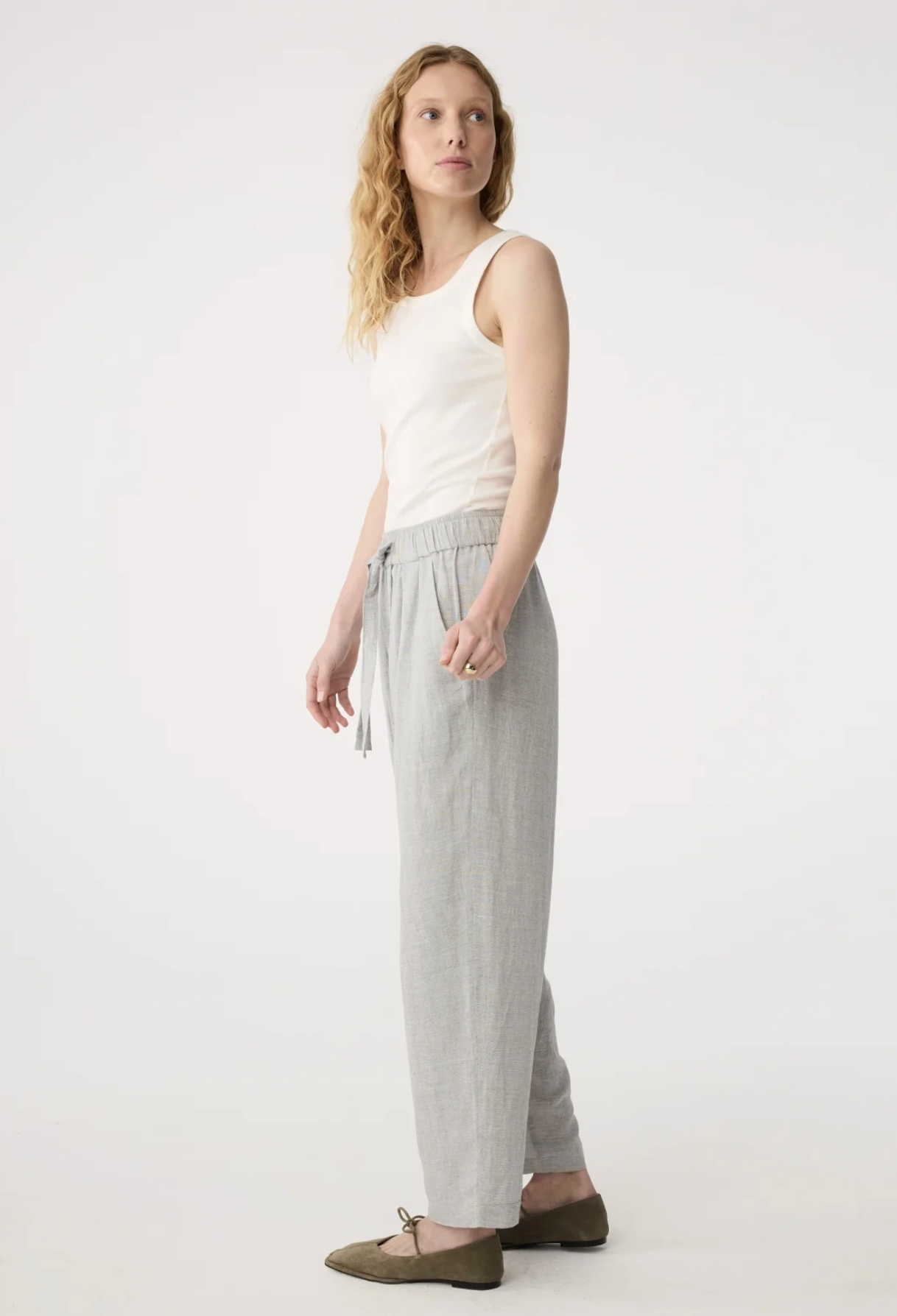 Sally brings together soft structure and elegant style. The viscose-linen blend gives her that breezy linen look, but with a smoother feel. The tapered fit drapes loosely around the legs and narrows gently at the ankle. An elastic waistband with a tie detail adds comfort without losing elegance. Side pockets and a fluid silhouette complete the formula for easy dressing, on days when you want both ease and polish.