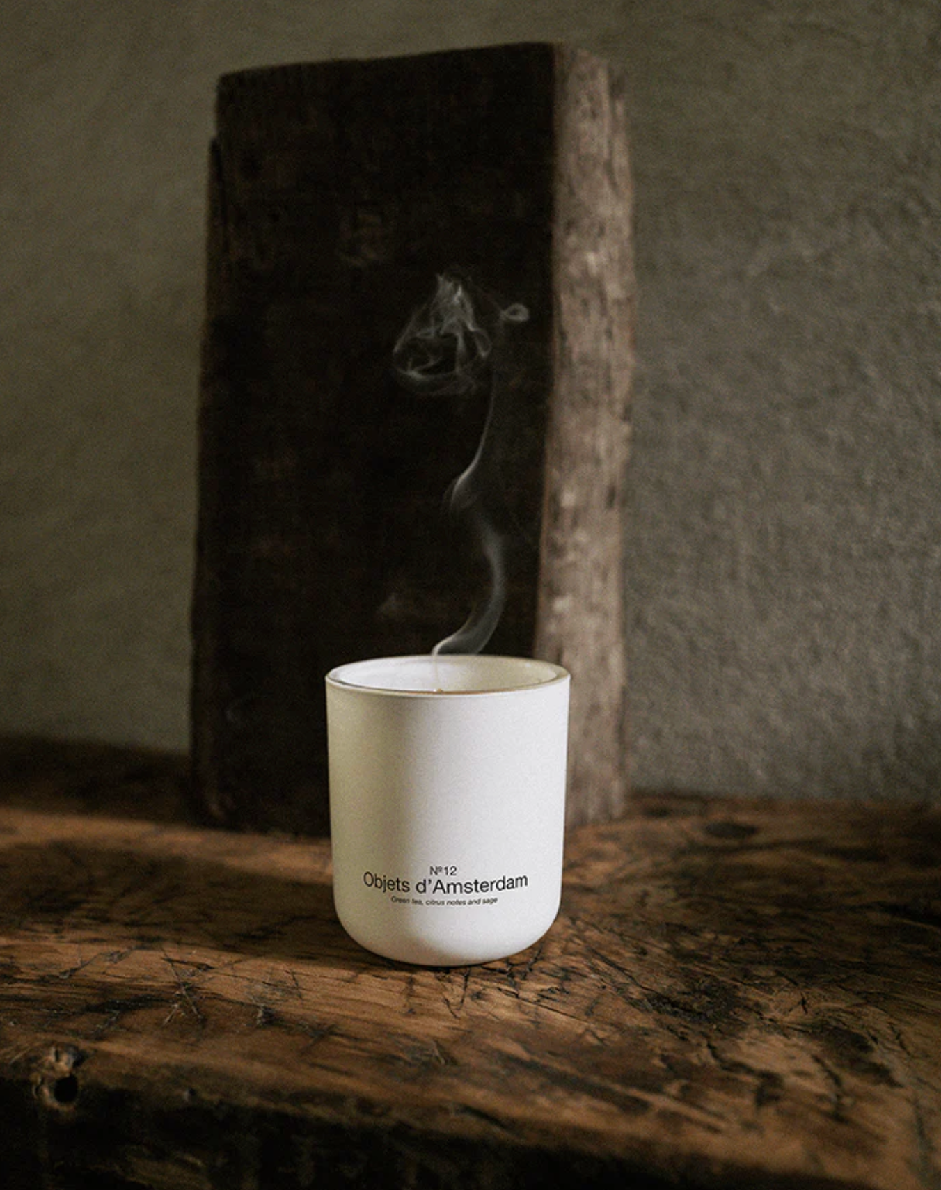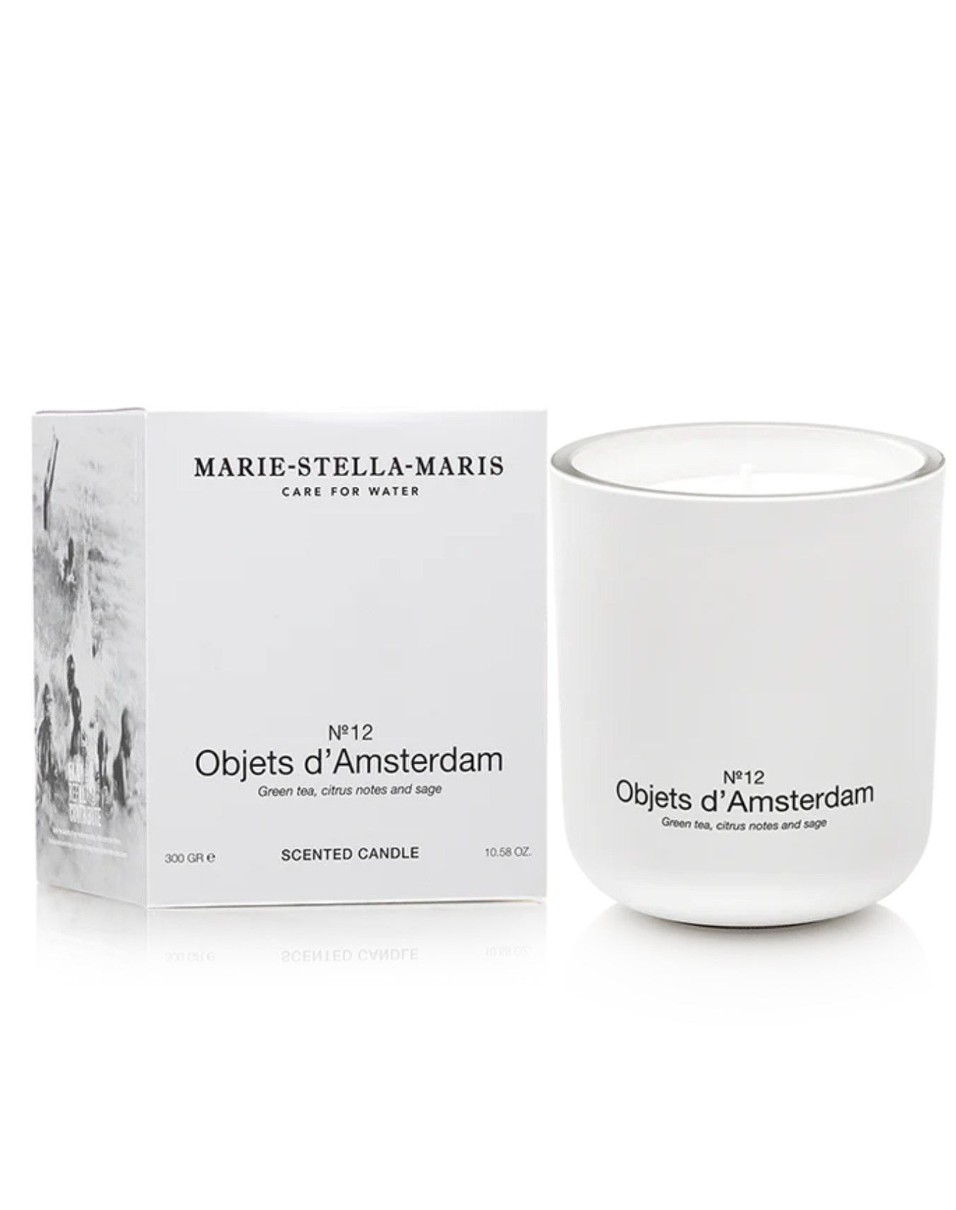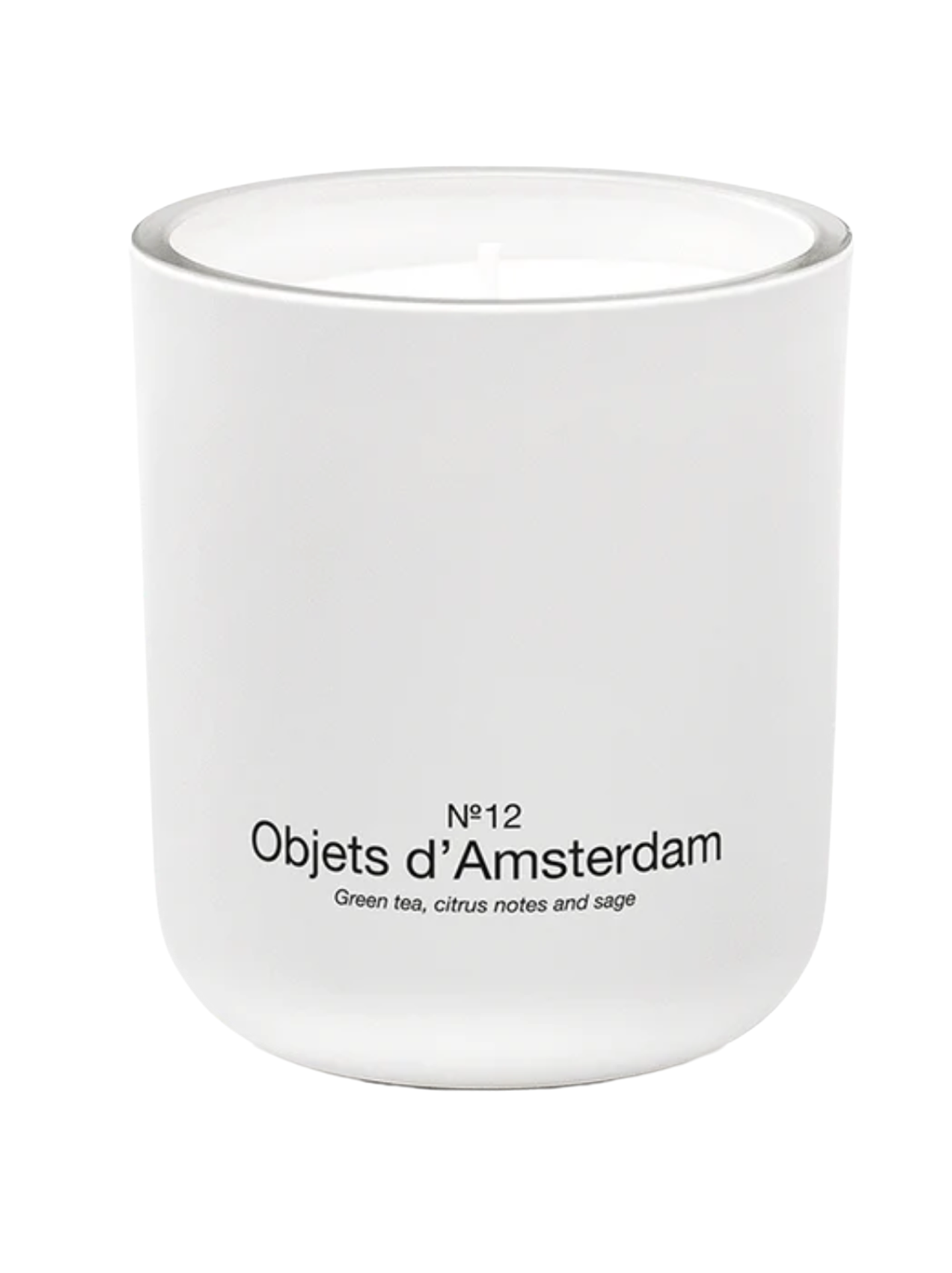 Enjoy the luxury scented candle in the No.12 Objets d'Amsterdam. With fragrance notes of green tea, citrus and sage, the candle subtly diffuses a sparkling scent. The candle features a matte white finish with a glossy black print – the iconic Marie-Stella-Maris logo on one side and the fragrance name on the other. -