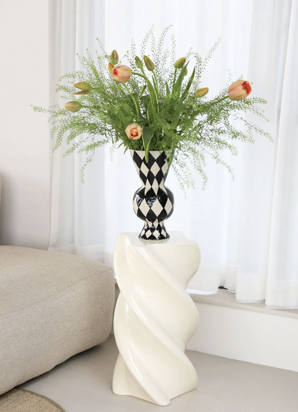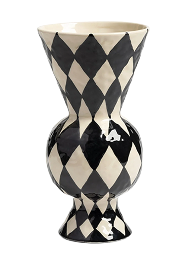 Checkered vase made of earthenware, with a height of 29.5 cm and a diameter of 16 cm.
