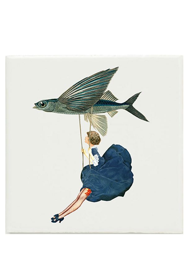 Wall Tile collage dametje hangend aan vliegende vis Lylies